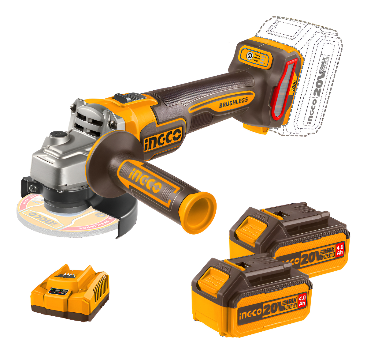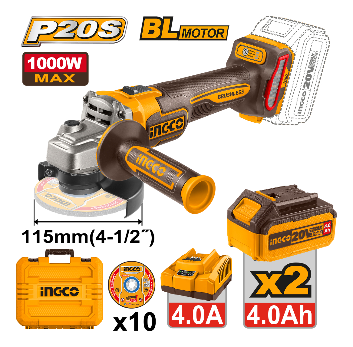 AMOLADORA ANGULAR 115MM A BATERIA P20S 20V BRUSHLESS + 10 DISCOS + 2 BAT 4.0AH + CARGADOR + VALIJA INGCO CAGLI271532