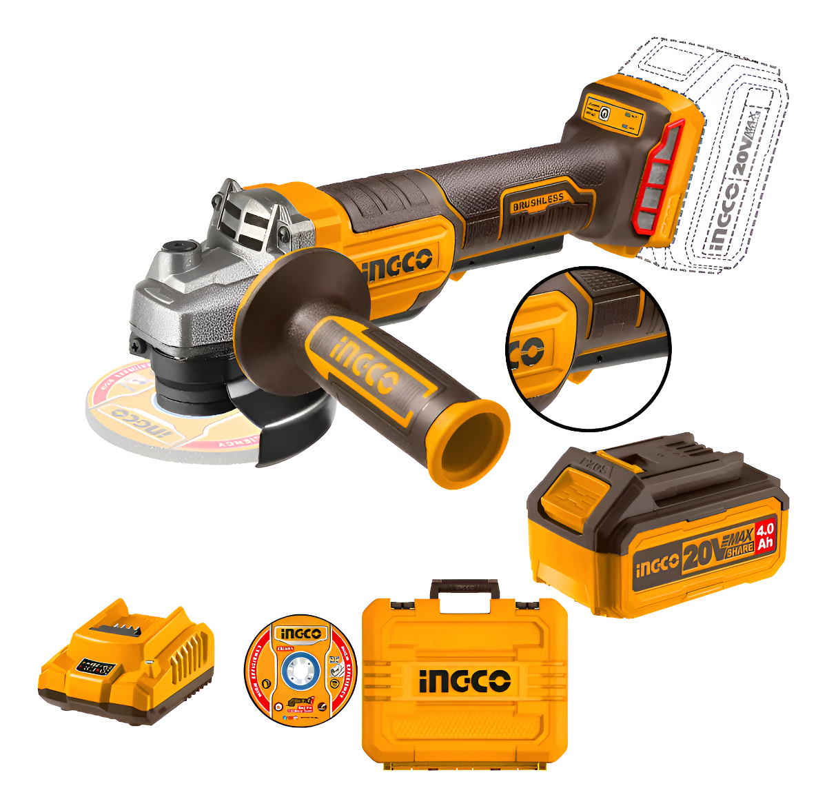 AMOLADORA A BATERIA 20V P20S 4 1/2″ BRUSHLESS CON INTERRUPTOR DE SEGURIDAD C/1 BAT + ACCESORIOS EN VALIJA