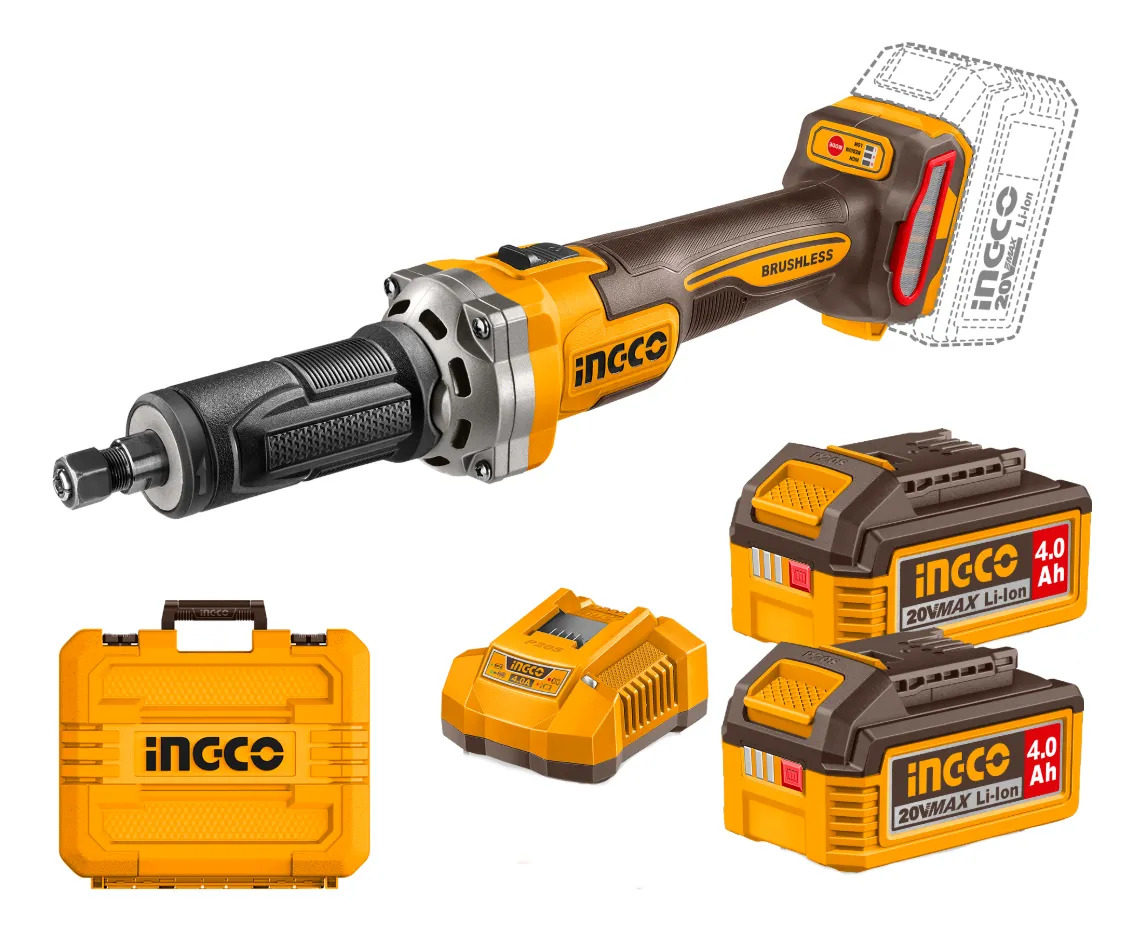 AMOLADORA RECTA A BATERIA 20V 6MM + 5 PUNTAS + 2 BAT 4.0AH + CARGADOR + VALIJA
