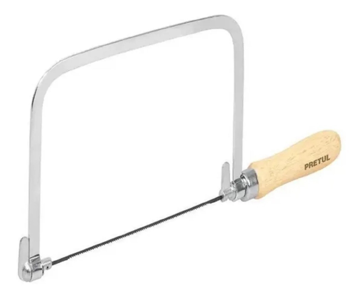 Arco de sierra para calado de cuerpo fabricado en acero SAE 1010. Mango en madera pulida, barnizada y estampada. Incluye 5 hojas de 6″ para diferentes tipos de corte: extrafina para plásticos y maderas suaves; mediana para plásticos y maderas semiduras; fina para perfiles y madera dura y una para metales no ferrosos. Dimensiones: Largo Total: 290mm (11,4″) / Profundidad de corte: 127mm / Angulo de corte: 90°