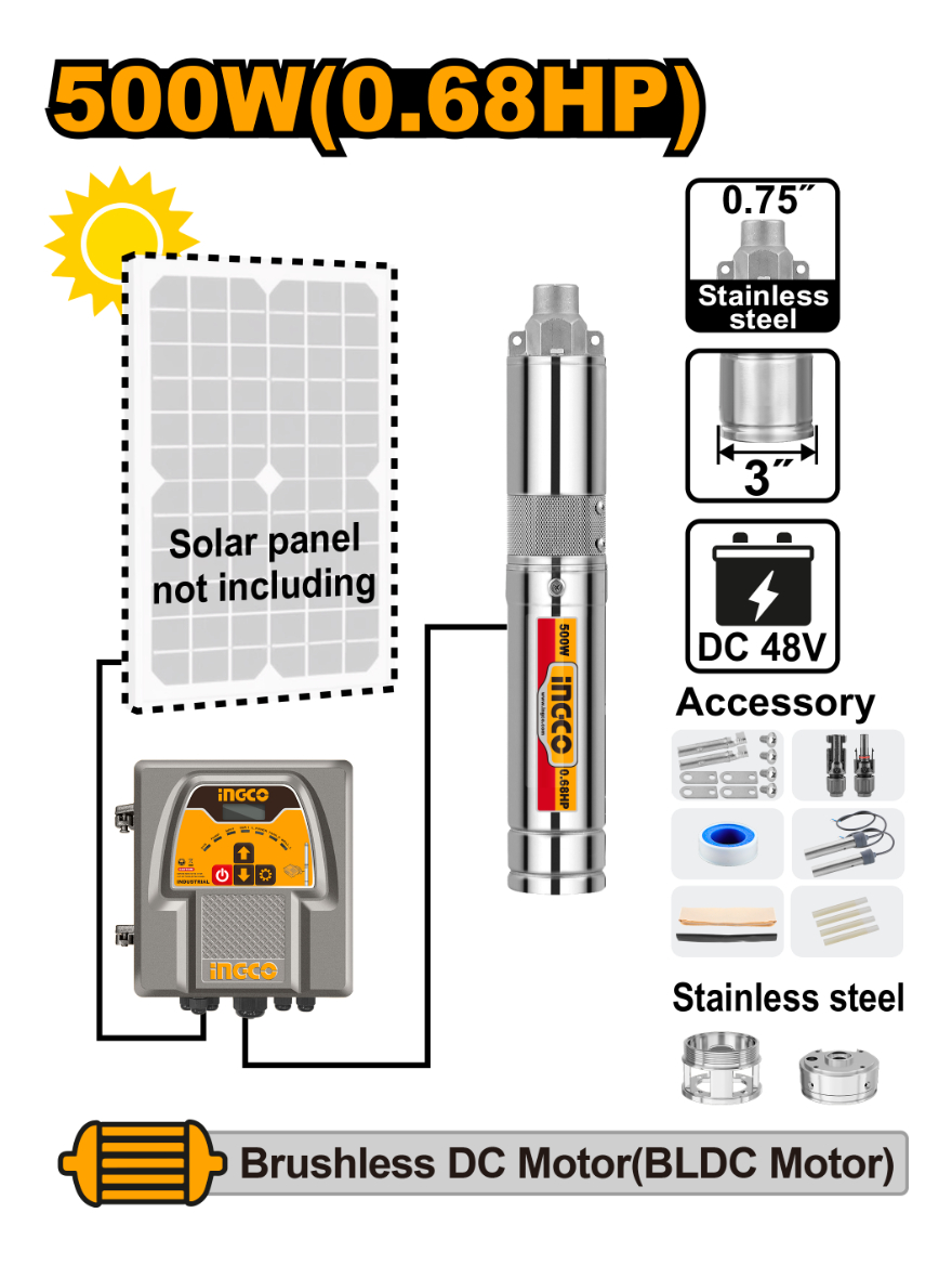 BOMBA SOLAR TIPO GUSANO 500W (0.68HP) 48V ALTURA 110M CAUDAL 2M3/H S/PANEL SOLAR INGCO SWPDC5006