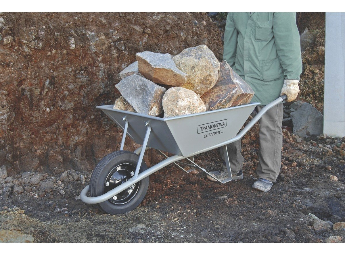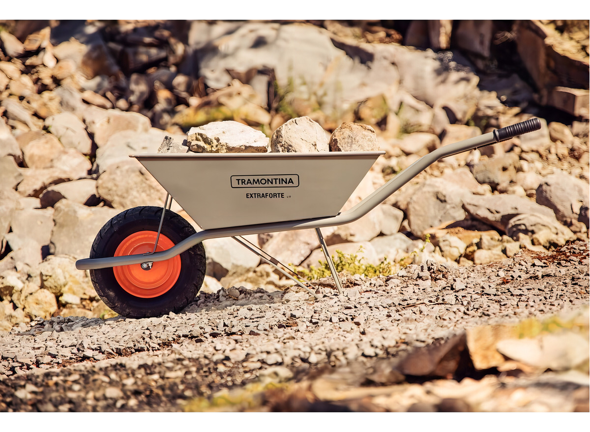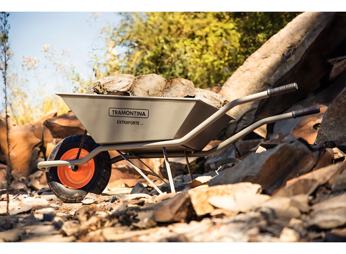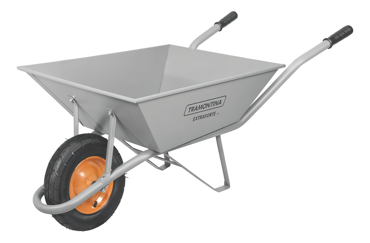 Extra Strong con cubeta metálica extra fuerte gris de 65 L, brazo metálico y neumático entubado. Su cubeta metálica tiene un refuerzo especial, que permite el transporte y la carga de cargas de hasta 65 litros. Sus brazos son metálicos, también de color gris y garantizan un manejo súper seguro. ¡Artículos prácticos y de gran durabilidad que puede encontrar con Tramontina!