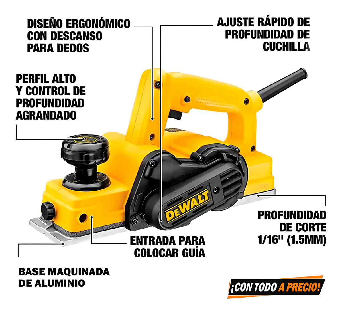 Rapidez y precisión logran describir a la cepilladora eléctrica DeWalt D26676. Gracias a su motor de 580W y 7000rpm, el producto permite realizar rebajes rápidos y precisos de hasta 1mm en superficies planas. Además posee una base de aleación de aluminio para mayor durabilidad.