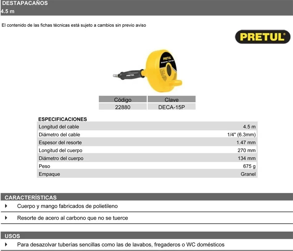 Cinta Destapa Caños 4,50 Metros Pretul Resorte De Acero