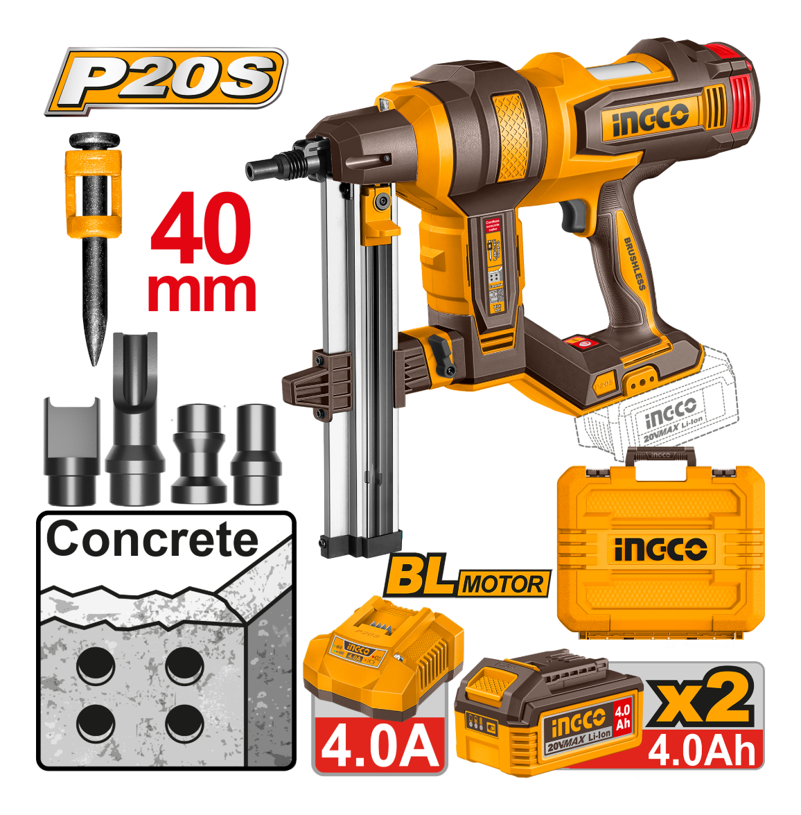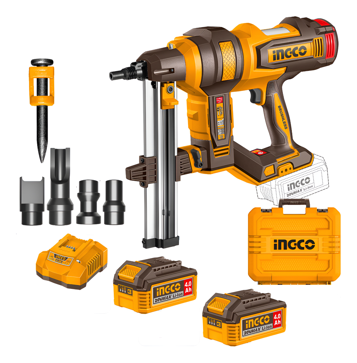 CLAVADORA P/CONCRETO A BATERIA 20V 40MM BRUSHLESS C/ 2 BAT 4.0AH + CARGADOR + ACCESORIOS + VALIJA INGCO CCNLI9008