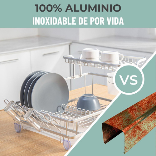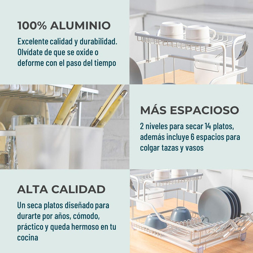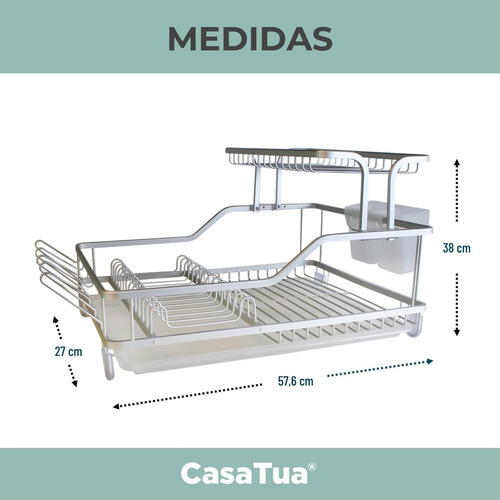 Con un largo de 57.6 cm y un ancho de 27 cm, este modelo SECALUMINIO 1.5 NIVELES se adapta fácilmente a cualquier lugar de colocación. Su diseño compacto y funcional te permite mantener tu cocina organizada y libre de platos mojados.