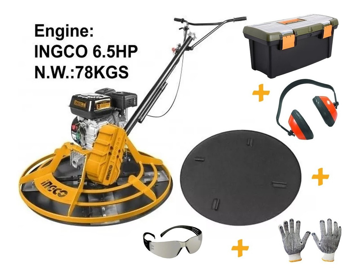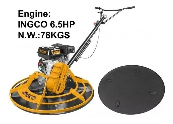 Motor de gasolina INGCO Potencia del motor: 4.8Kw (6.5HP) Peso: 78kg. Diámetro del rotor: 91 cm (36 «) Número de cuchilla: cuatro cuchilla de acabado: 35X15 cm (6X14 «) Cuchilla incluida Embalado por caja de cartón