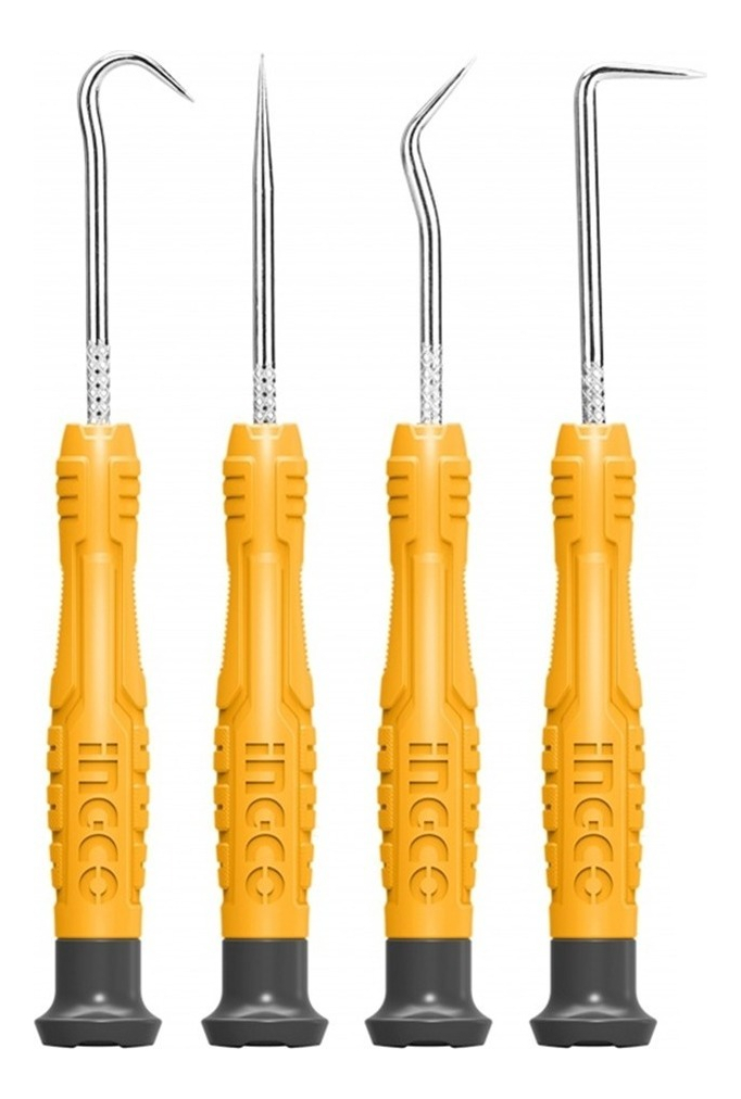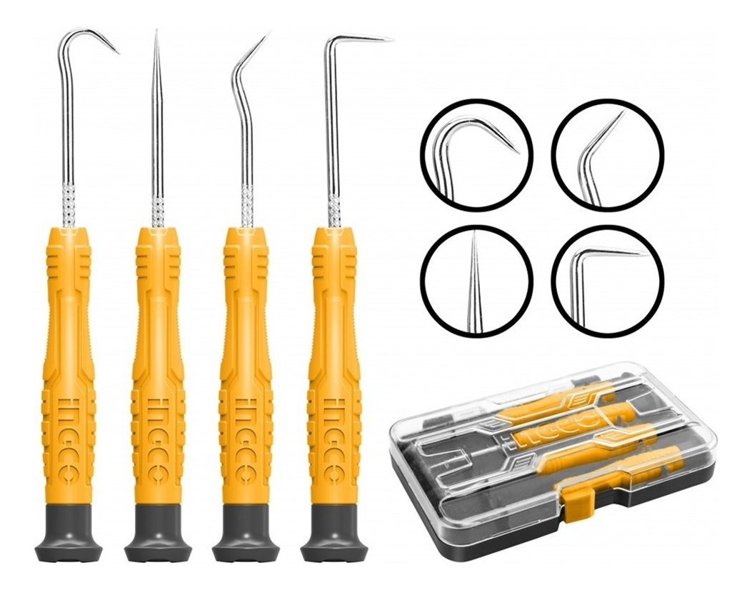 Juego de ganchos y ganzúas de 4 pza Mango de nuevo diseño INGCO Lista de productos 1 pza de gancho completo 1 pza de 45 grados 1 pza de 90 grados Selección recta de 1 pza Embalado por caja de plástico