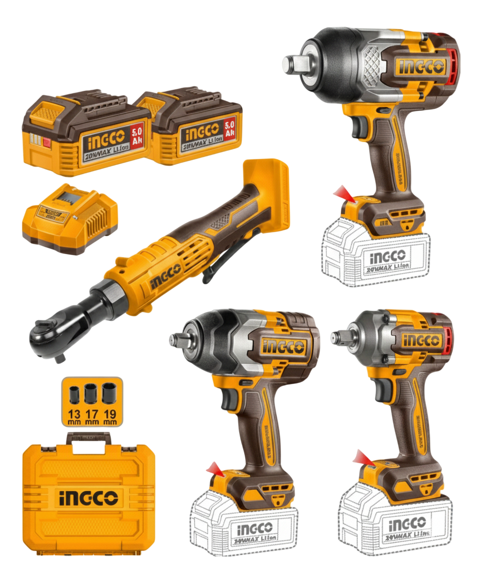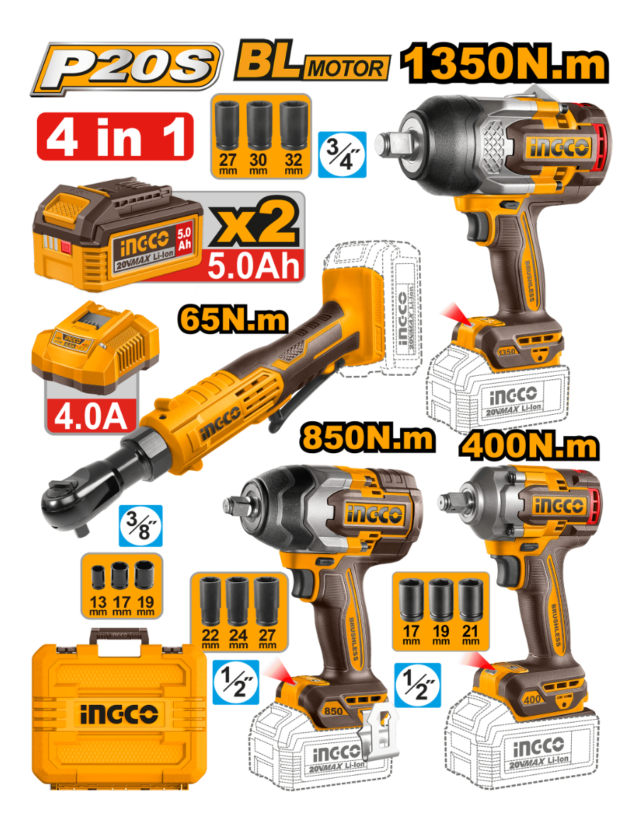 KIT COMBO A BATERIA P20S 3 LLAVES DE IMPACTO 3/4″ 1350NM + 1/2″ 850NM + 1/2″ 400NM + LLAVE CRIQUE 65NM 3/8″ + 2 BAT 5.0AH + CARGADOR + DADOS + VALIJA