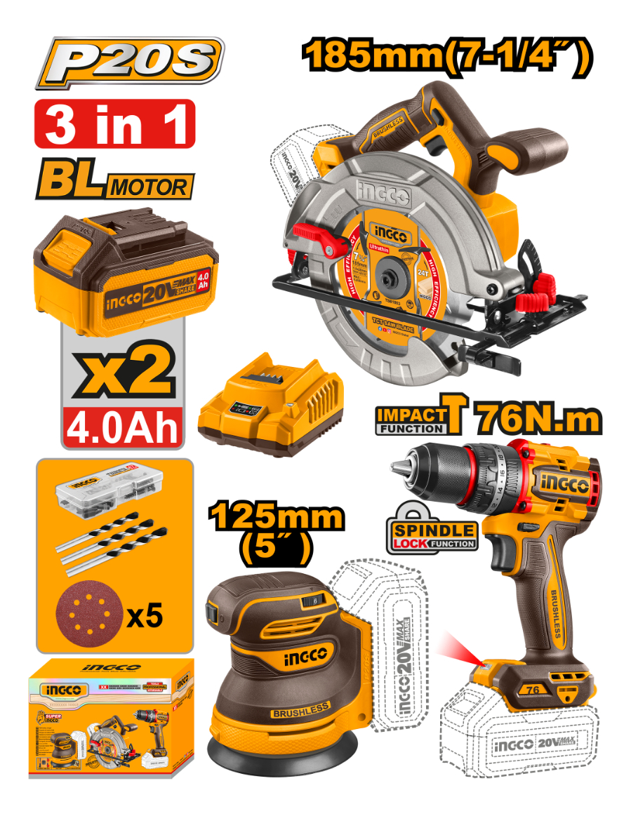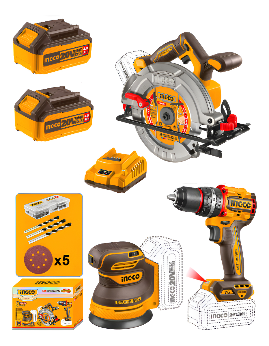KIT COMBO A BATERIA P20S BRUSHLESS SIERRA CIRCULAR + LIJADORA ROTO ORBITAL + TALADRO ATORNILLADOR C/PERCUTOR 76NM + 2 BAT, CARGADOR Y ACCESORIOS INGCO COSLI250181