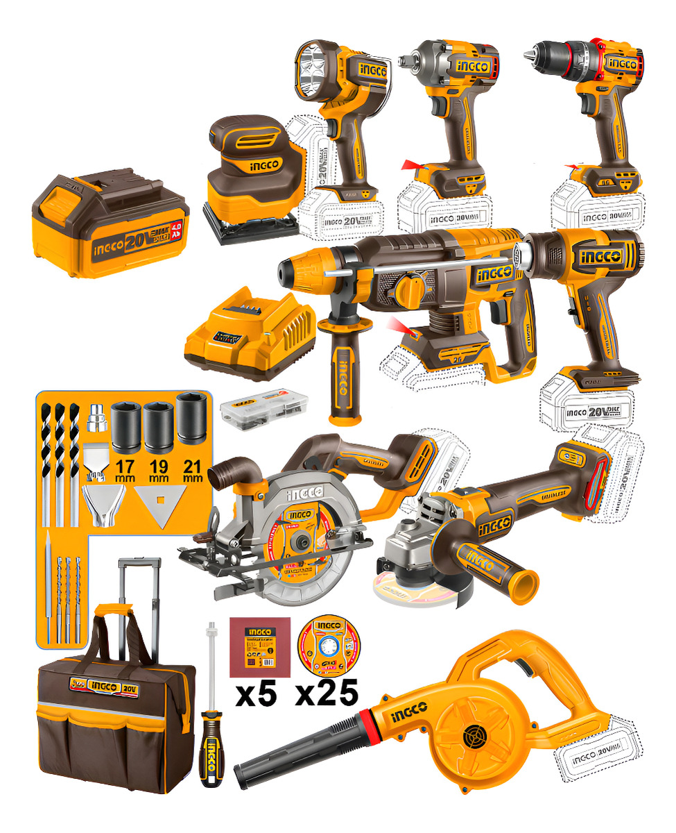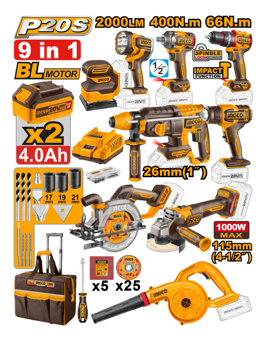 KIT COMBO INDUSTRIAL 9 HERRAMIENTAS A BATERIA P20S 20V BRUSHLESS + 2BAT, CARGADOR, ACCESORIOS Y VALIJA