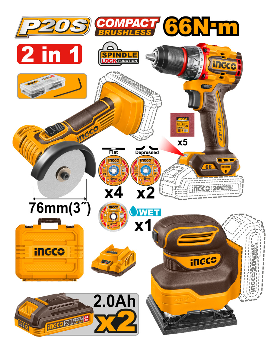 KIT A BATERIA P20S 20V MINI AMOLADORA 3″ MULTIFUNCION + TALADRO ATORNILLADOR 66NM + 2BAT, CARGADOR, VALIJA Y ACCESORIOS