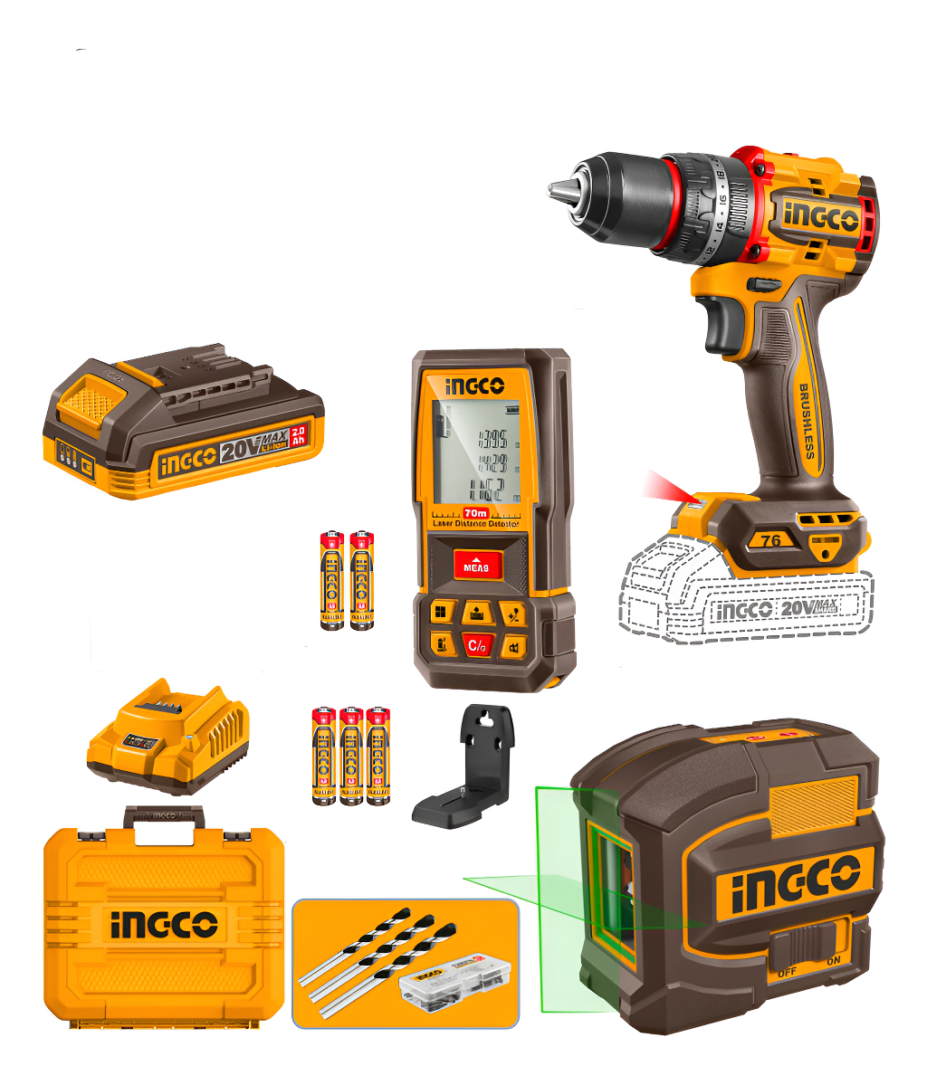 KIT COMBO P20S 20V TALADRO ATORN. C/PERCUTOR 76NM + NIVEL LASER AUTONIVELANTE 35MTS LUZ VERDE + MEDIDOR DE DISTANCIA 70 MTS C/ESTUCHE + 2 BAT 2.0AH + CARGADOR + ACCESORIOS + VALIJA