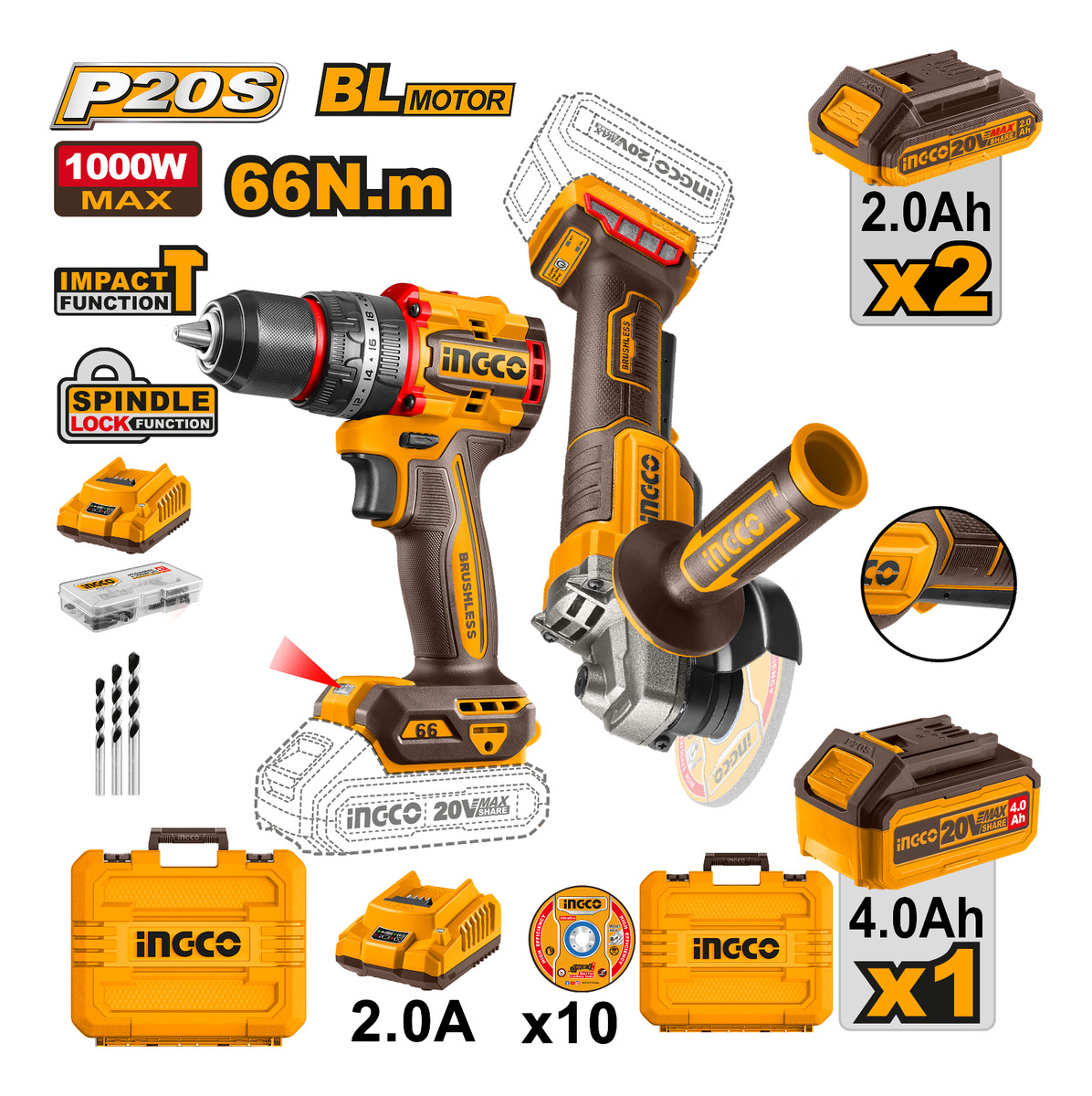 TALADRO ATORNILLADOR C/PERCUTOR A BATERIA 13MM COMPACT BRUSHLESS 20V P20S EN VALIJA C/2 BAT + 47 ACCESORIOS – CIDLI20668