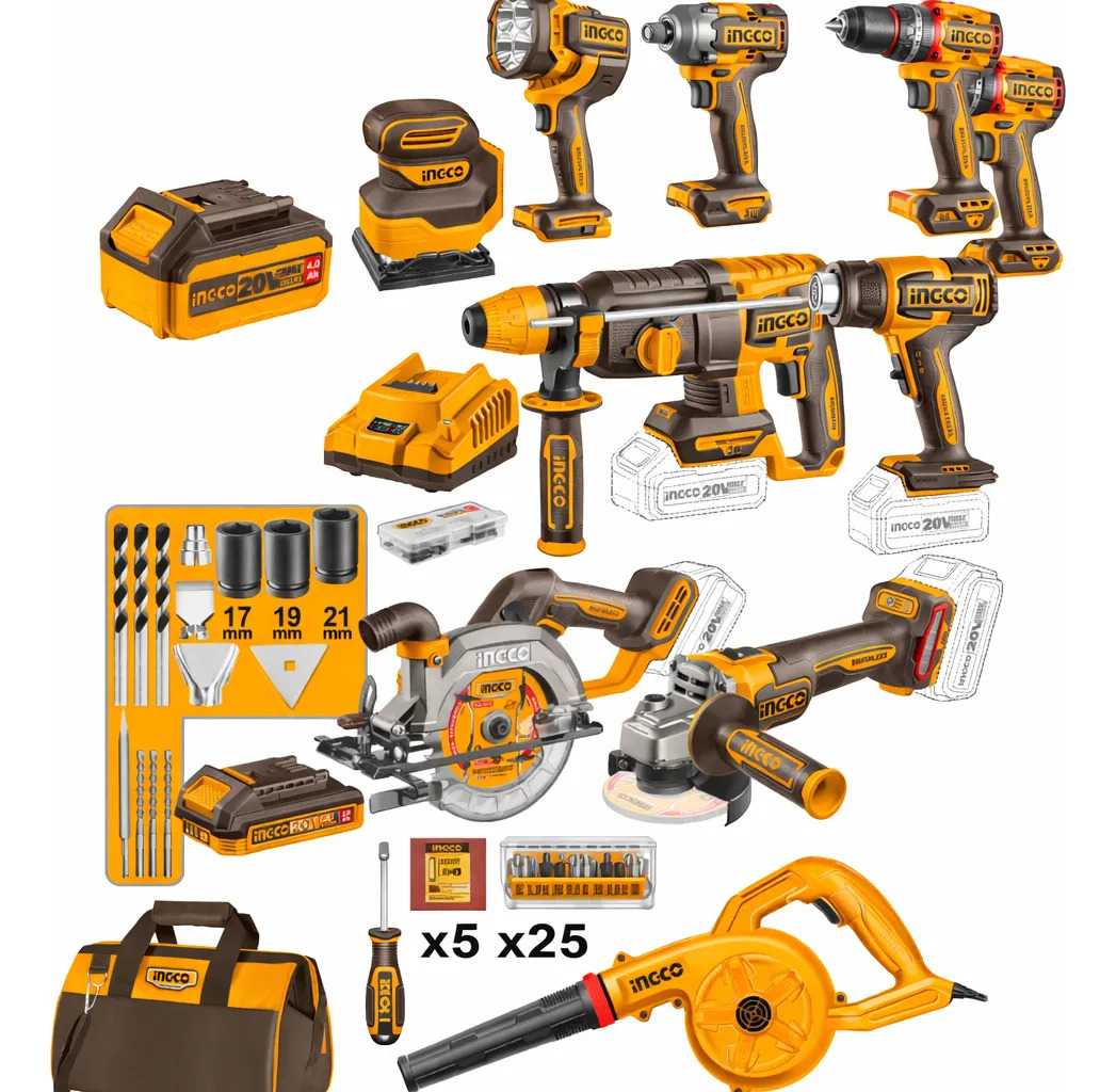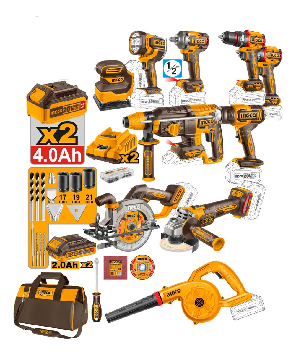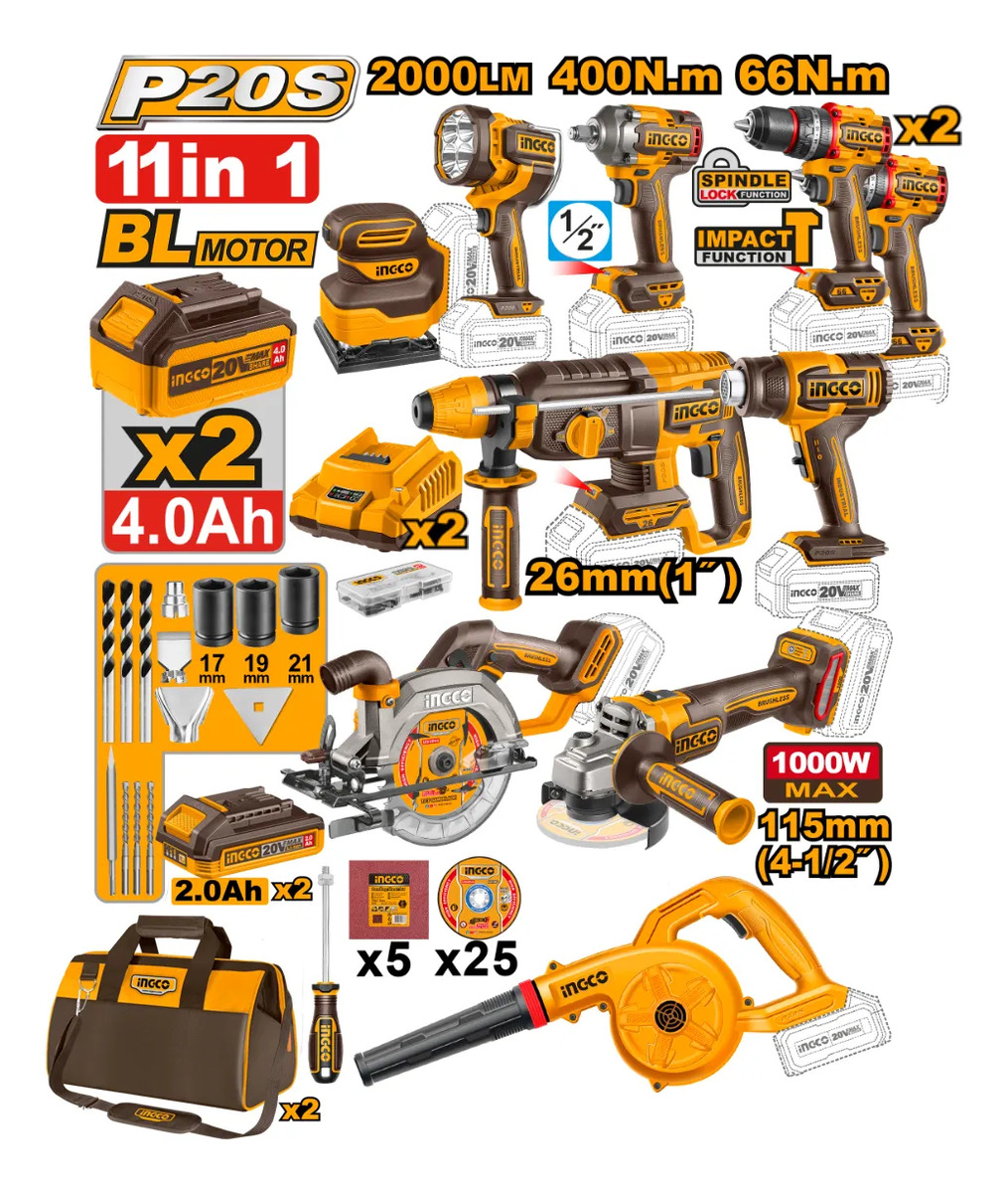 KIT COMBO INDUSTRIAL 9 HERRAMIENTAS A BATERIA P20S 20V BRUSHLESS + 2BAT, CARGADOR, ACCESORIOS Y VALIJA