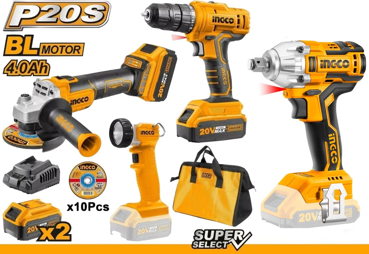 Kit 20v Ingco Amoladora + Atornillador + Linterna + Bolso 4.
