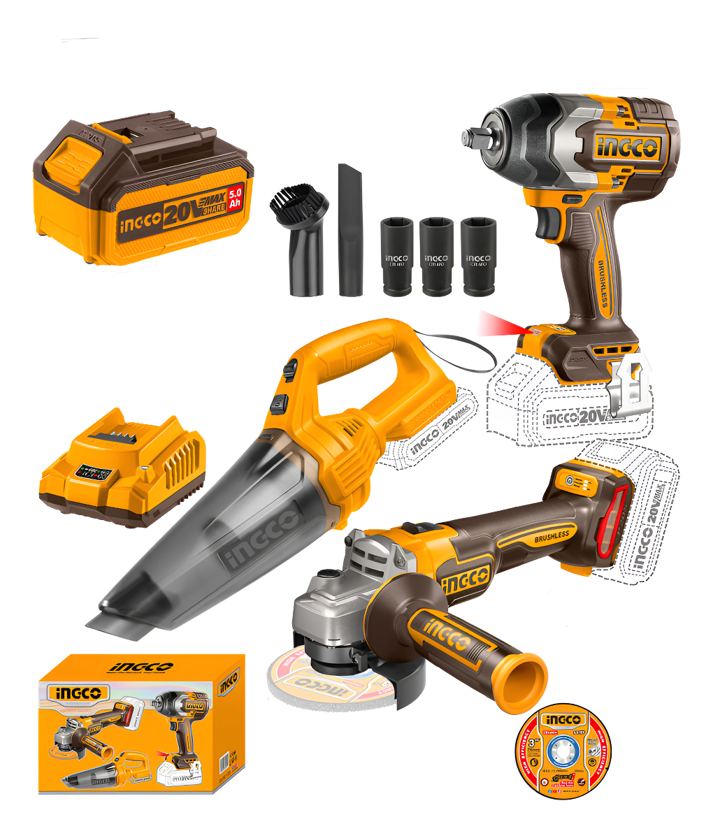 COMBO LLAVE DE IMPACTO A BATERIA 1/2″ 850NM BRUSHLESS 20V P20S + AMOLADORA A BATERIA 4 1/2″ BRUSHLESS 20V P20S + ASPIRADORA DE MANO A BATERIA 20V P20S EN CAJA C/2 BAT + ACCESORIOS