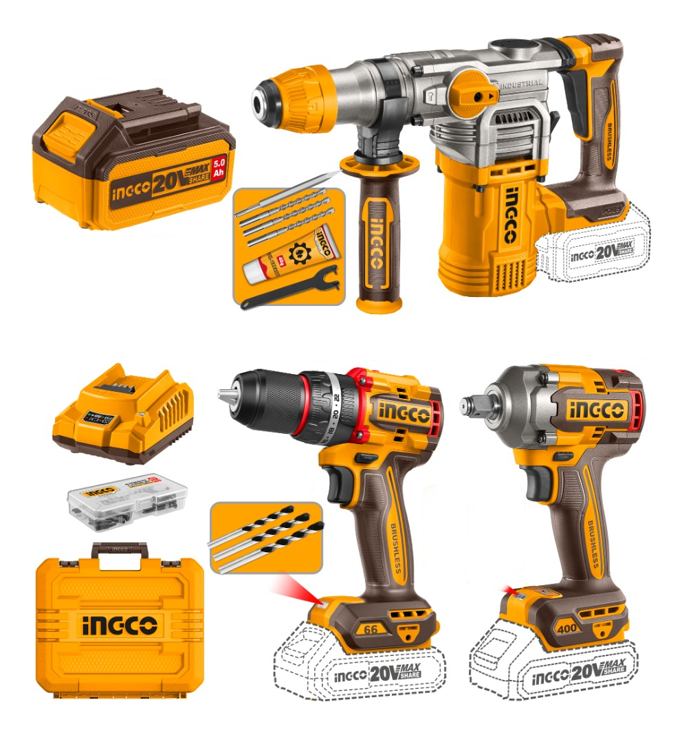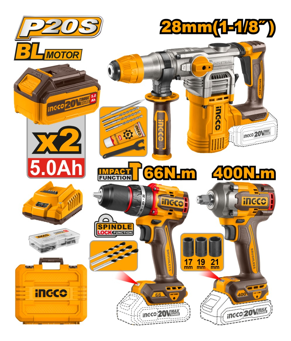 KIT COMBO A BATERIA P20S 20V C/ROTOMARTILLO + LLAVE DE IMPACTO + TALADRO ATORNILLADOR C/PERCUTOR C/ 2 BAT, CARGADOR, ACCESORIOS Y VALIJA INGCO CKLI20638