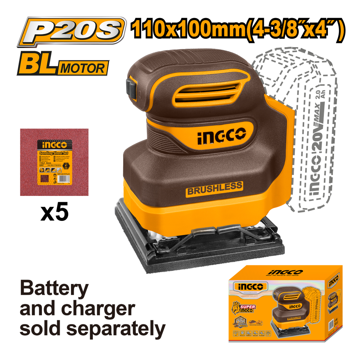 LIJADORA ORBITAL 20V P20S + 5 LIJAS SIN BAT SIN CARG INGCO CSHSLI2024