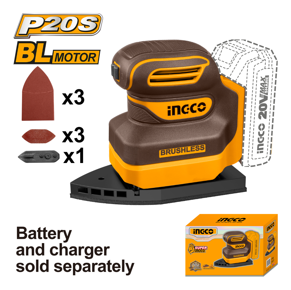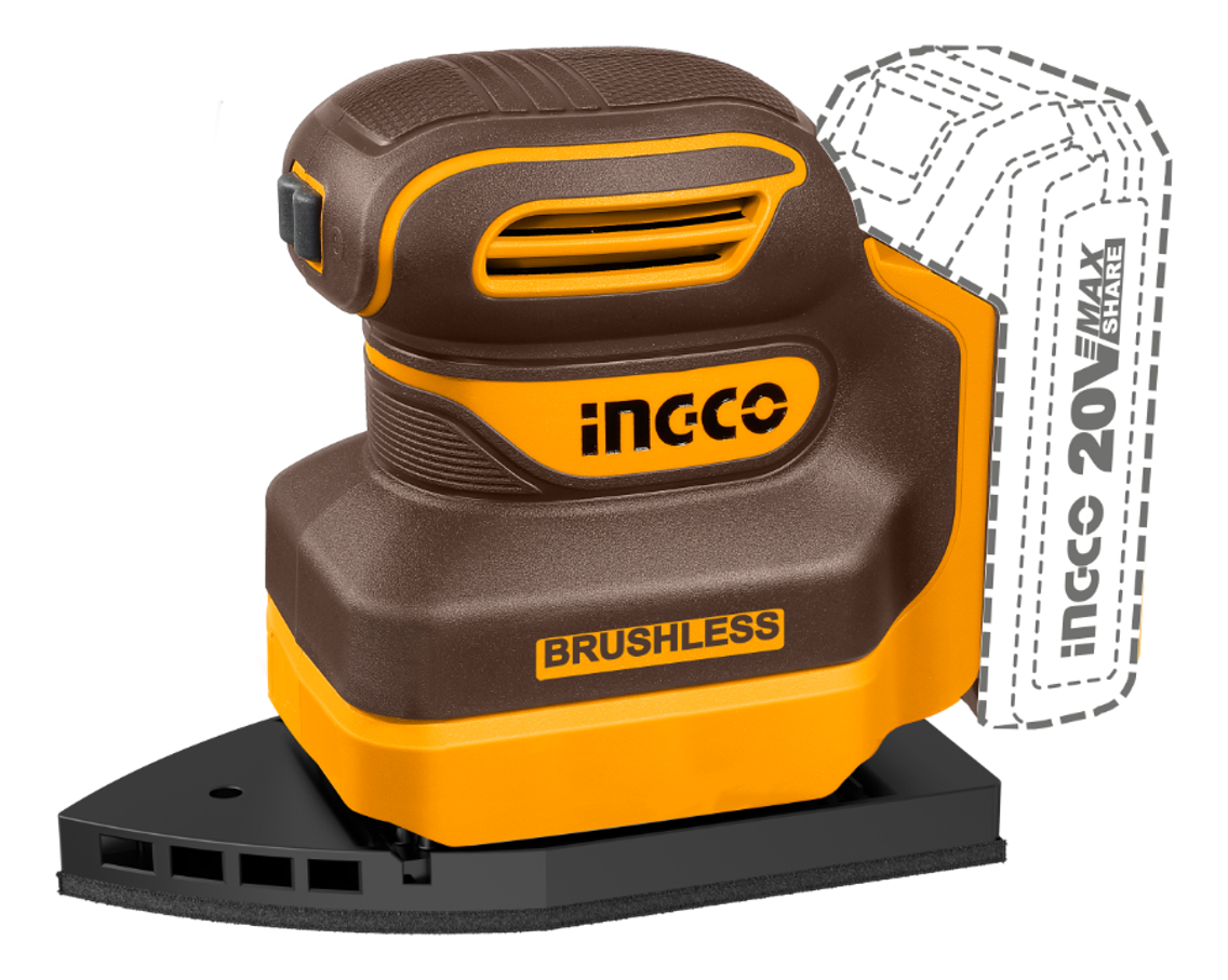 LIJADORA ORBITAL DELTA A BATERIA P20S 20V + LIJAS S/BAT S/CARG INGCO CPSLI2024