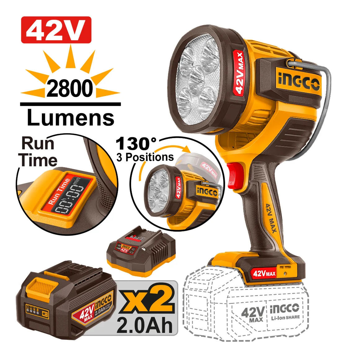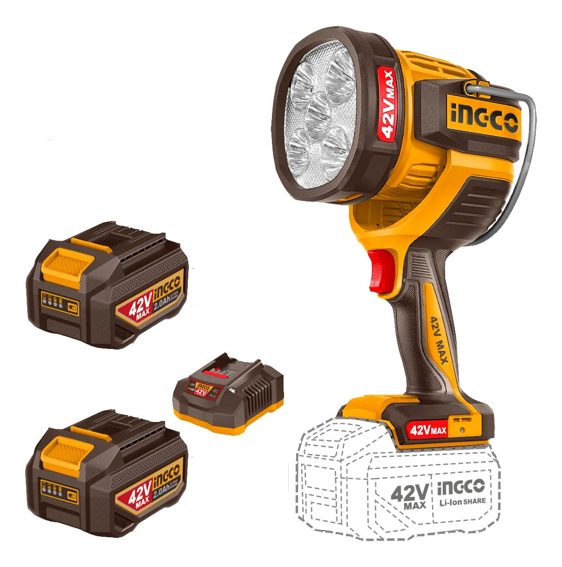 LINTERNA A BATERIA 42V 50W 2800 LUMENS + 2 BAT 2.0AH + CARGADOR