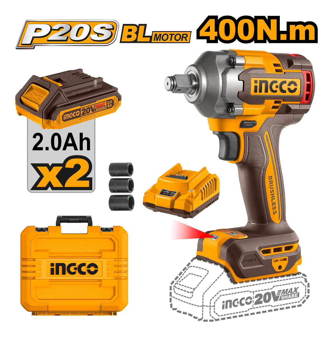 LLAVE DE IMPACTO 400NM 20V P20S BL CON 2 BAT CARG + VALIJA