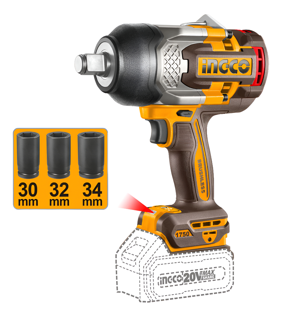 LLAVE DE IMPACTO 1750NM A BATERIA P20S 20V BRUSHLESS MOTOR + 3 DADOS SIN BAT SIN CARGADOR
