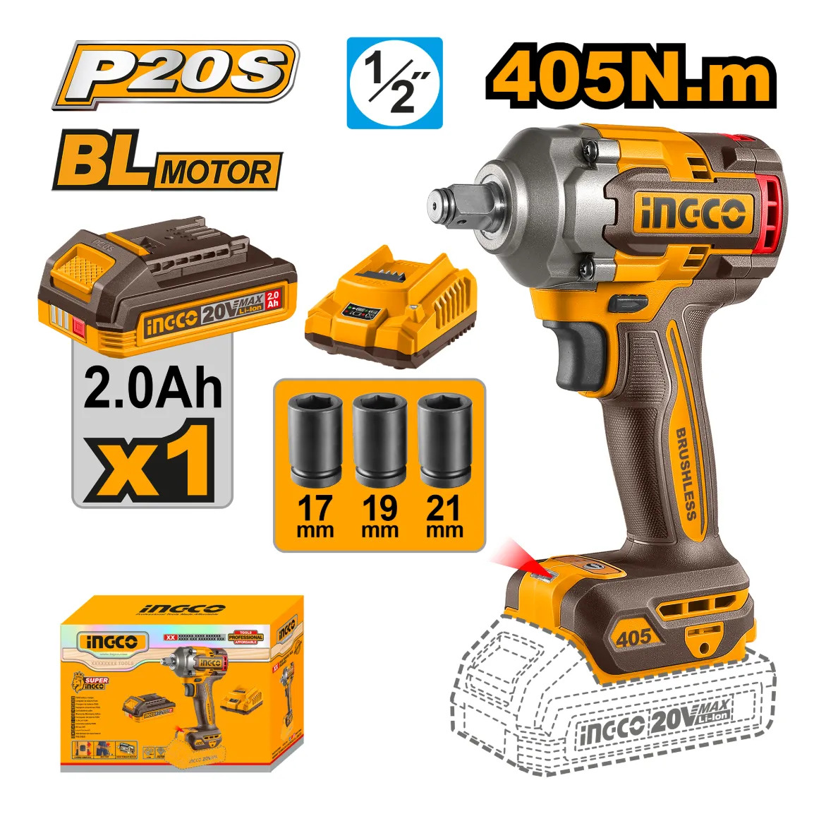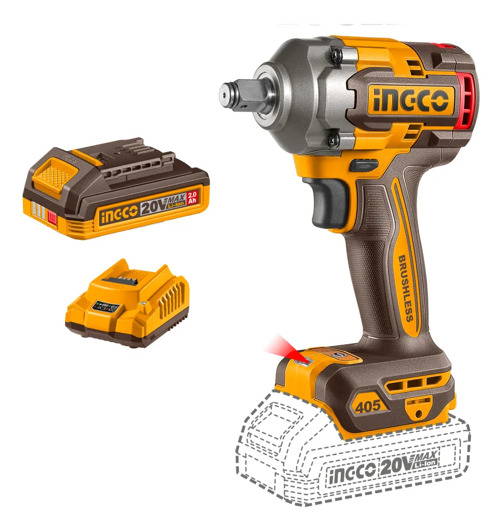 LLAVE DE IMPACTO A BATERIA 20V 405NM 1/2″ + BAT 2.0AH + CARGADOR + 2 DADOS 17 19 21MM