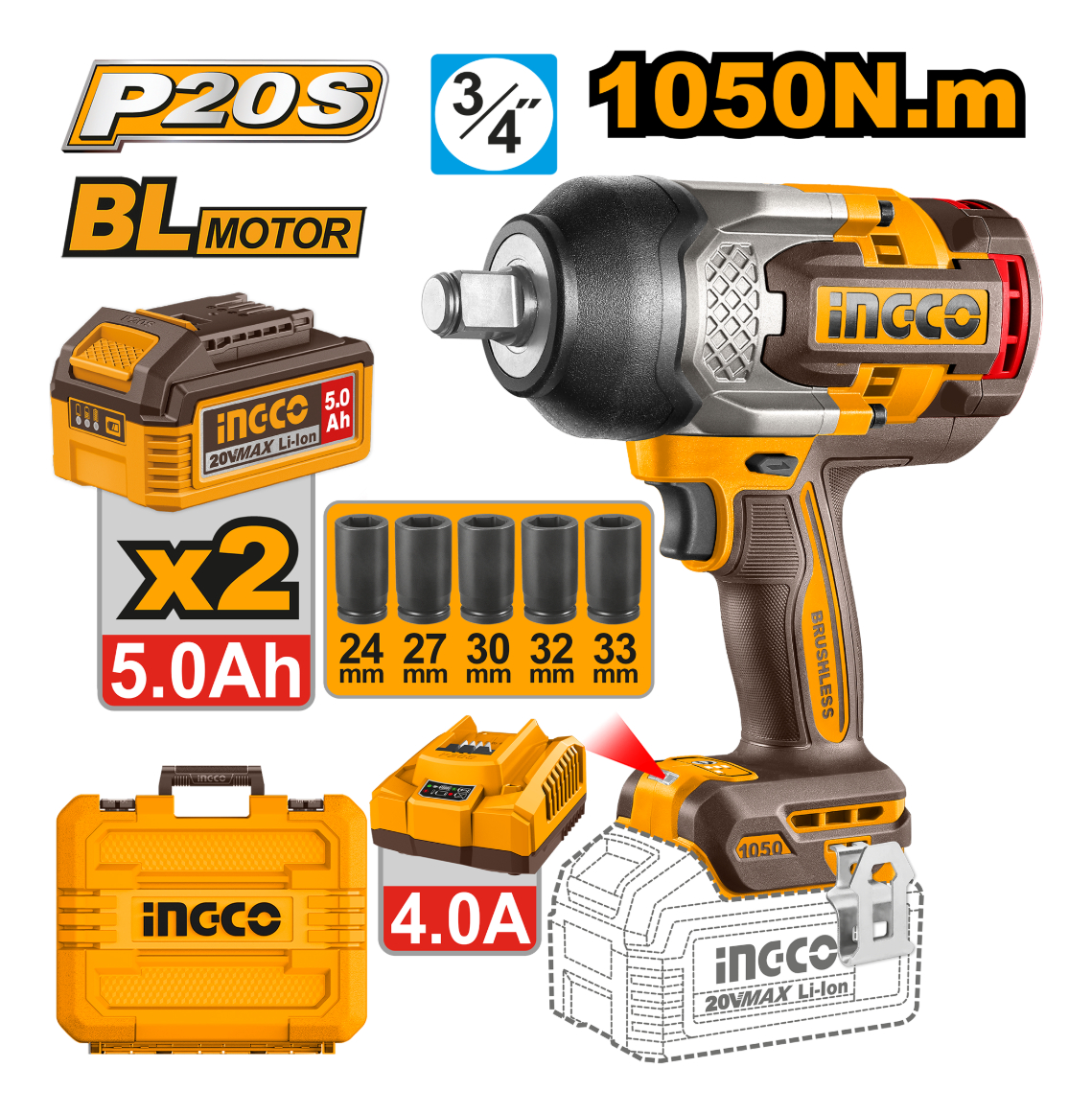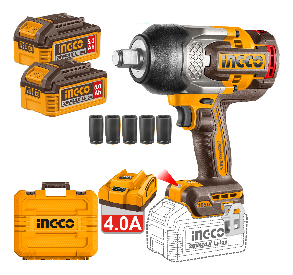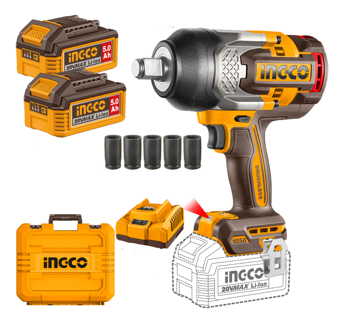 LLAVE DE IMPACTO A BATERIA P20S 20V BRUSHLESS 3/4″ 1050NM C/2 BAT 5.0AH + CARGADOR + DADOS + VALIJA INGCO CIWLI20105