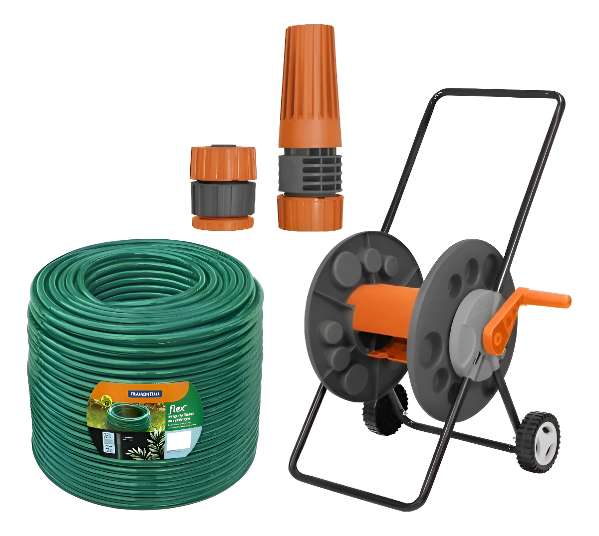 Manguera flex para jardín 1/2″, 30 m + juegos de acoples partes + Carro Enrollador