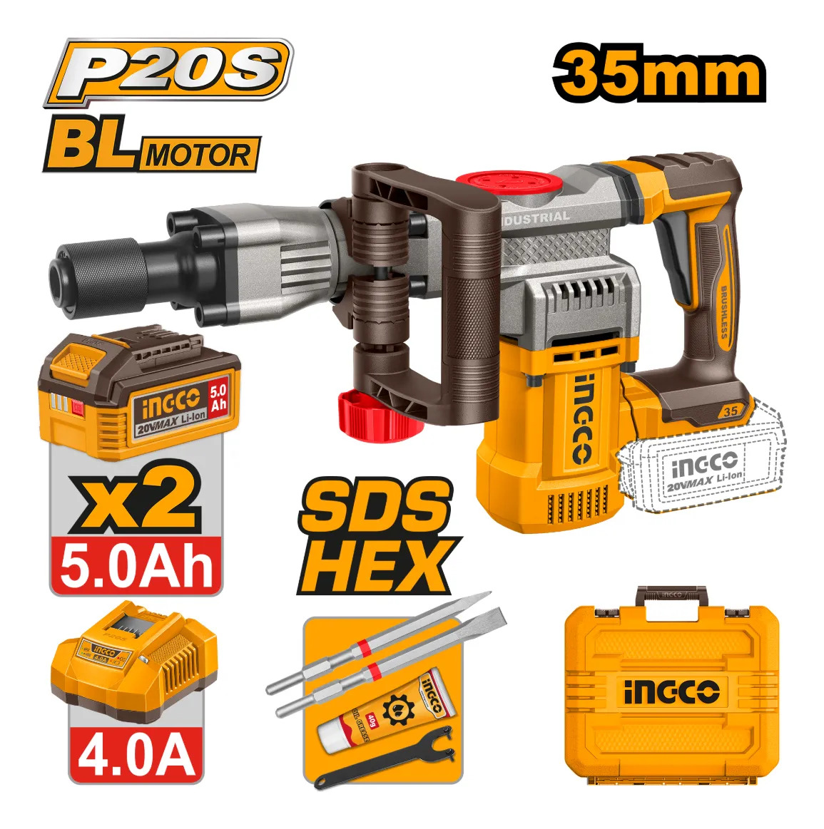 MARTILLO DEMOLEDOR A BATERIA P20S 20V 16J 35MM + 2 BAT 5.0AH + CARGADOR + ACCESORIOS + VALIJA