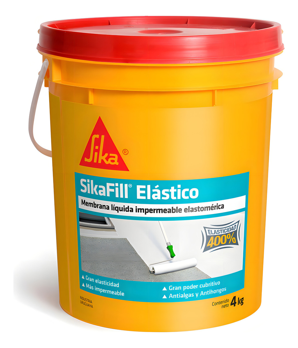 Membrana líquida Sikafill Elástico de 4 kg en color blanco, ideal para impermeabilizar terrazas y cubiertas con alta flexibilidad y resistencia a la intemperie.
