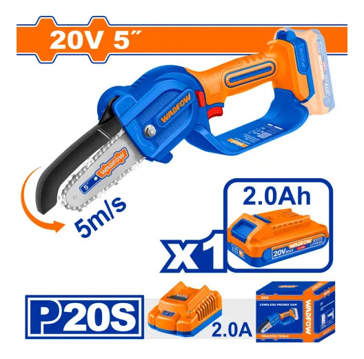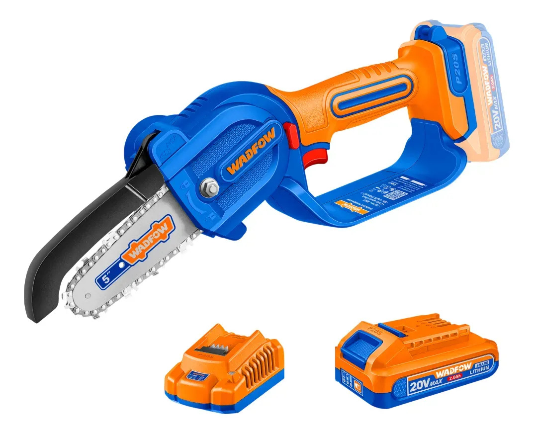 MINI MOTOSIERRA 5″ A BATERIA 20V C/CADENA + VAINA + LLAVE INGLESA + BOTELLA P/ACEITE + BAT 2.0AH + CARGADOR WADFOW WCLP556