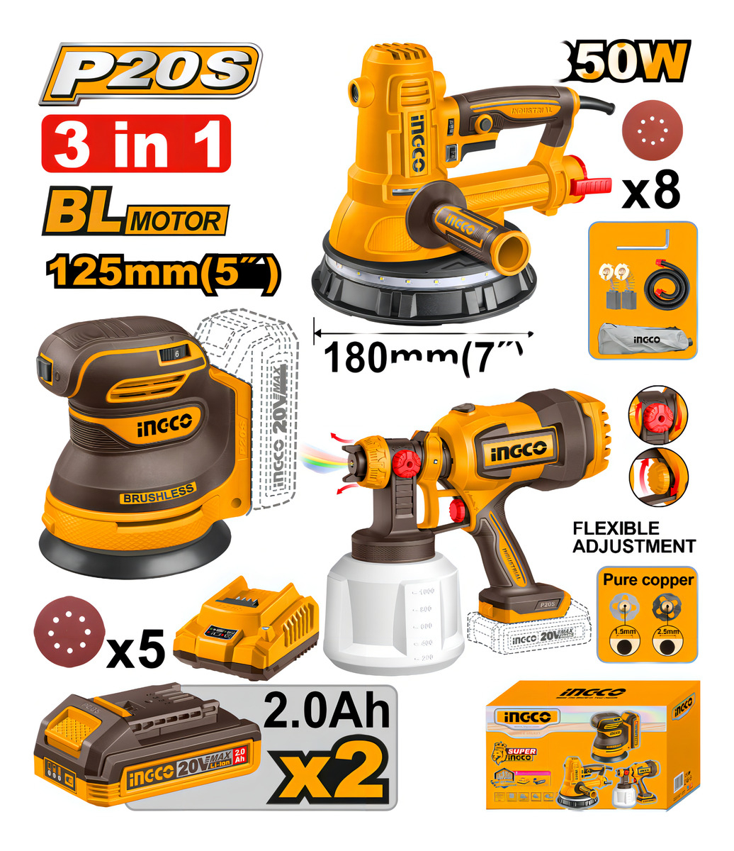 KIT A BATERIA P20S 20V LIJADORA DE YESO 850W 180MM 7″ + LIJADORA ROTO ORBITAL 125MM 7″ + PISTOLA DE PINTAR + 2 BAT, CARGADOR Y ACCESORIOS