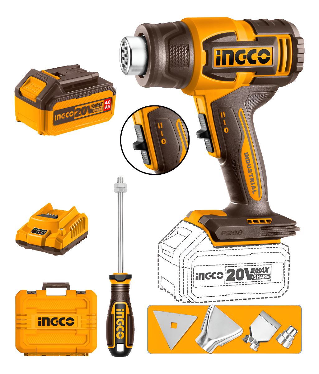 PISTOLA DE CALOR 550°C A BATERIA P20S 20V + BAT 4.0AH + CARGADOR + VALIJA + ACCESORIOS