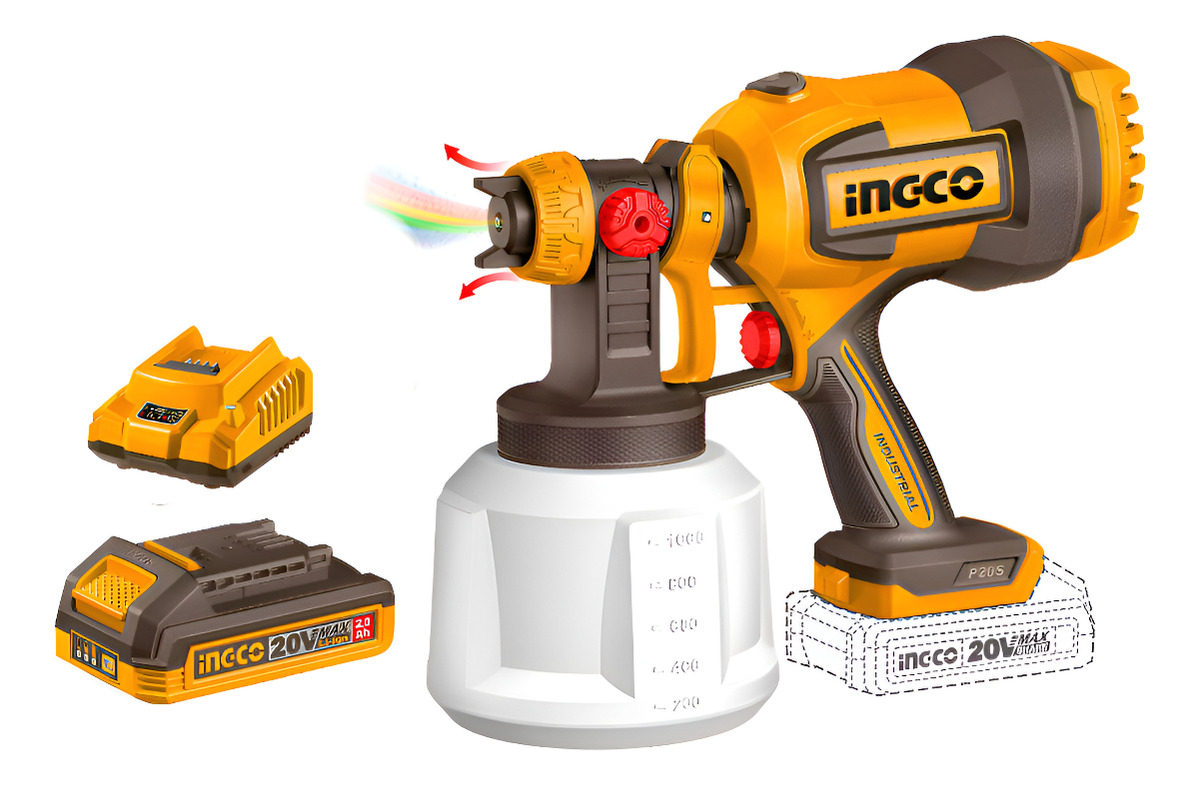 PISTOLA PARA PINTAR A BATERIA P20S 20V + BATERIA + CARGADOR + ACCESORIOS INGCO CSGLI20042
