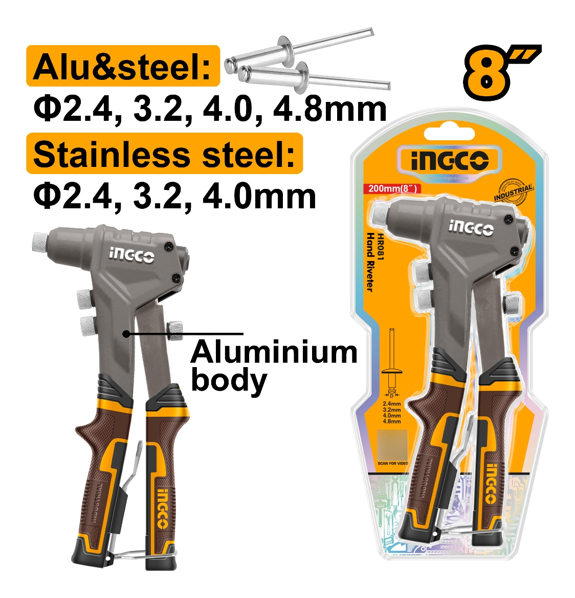 Aplicable a remaches de acero inoxidable, aluminio y acero.