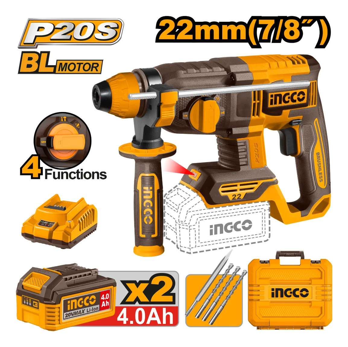 ROTOMARTILLO A BATERIA 22MM 20V BRUSHLESS C/ 2 BAT 4.0AH + CARGADOR + ACCESORIOS + VALIJA INGCO CRHLI212282