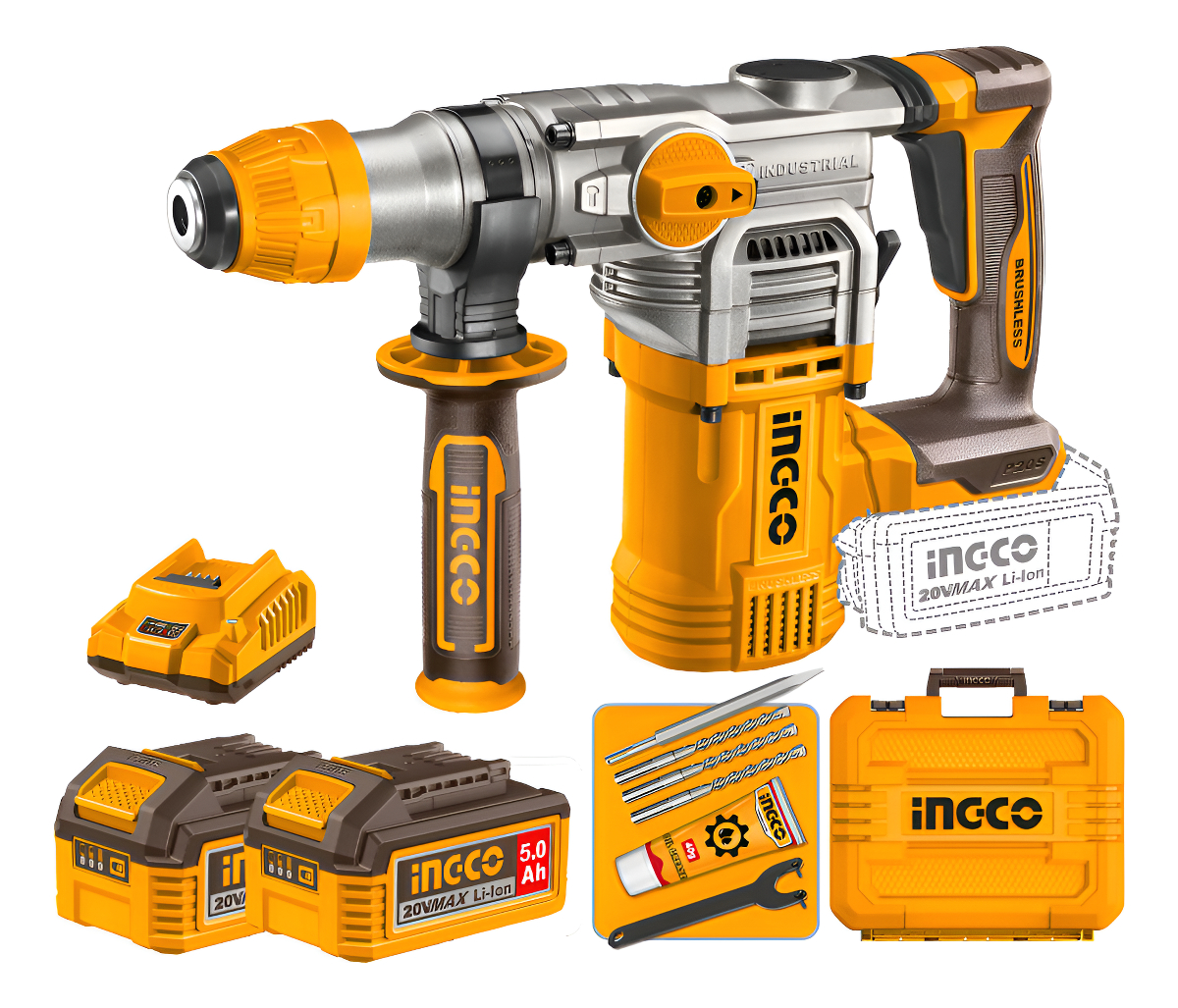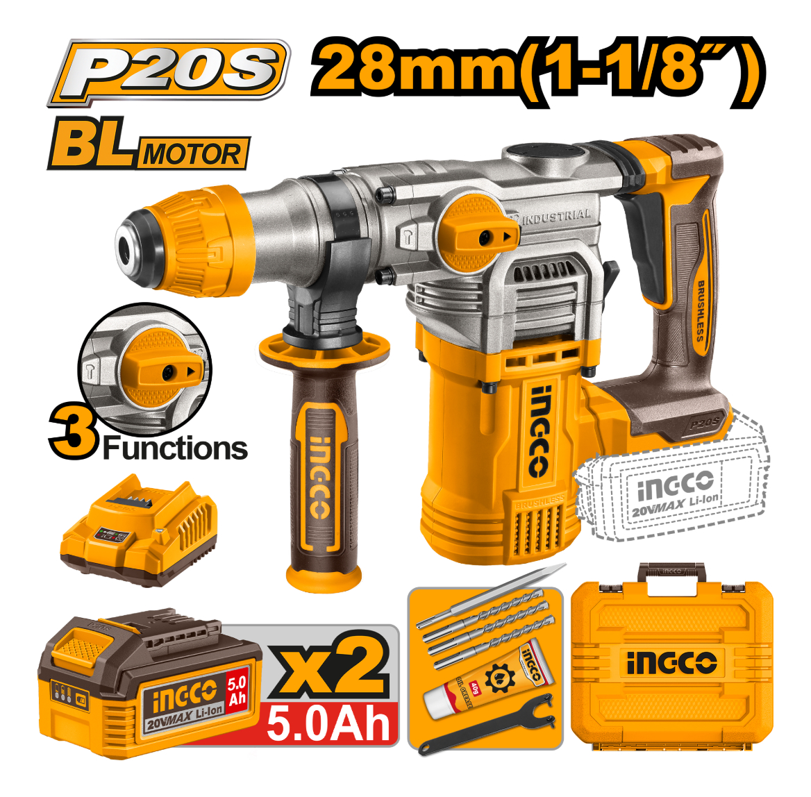ROTOMARTILLO A BATERIA 28MM P20S 20V 4.5J SDS PLUS + 2 BAT 5.0AH + CARGADOR + ACCESORIOS + VALIJA