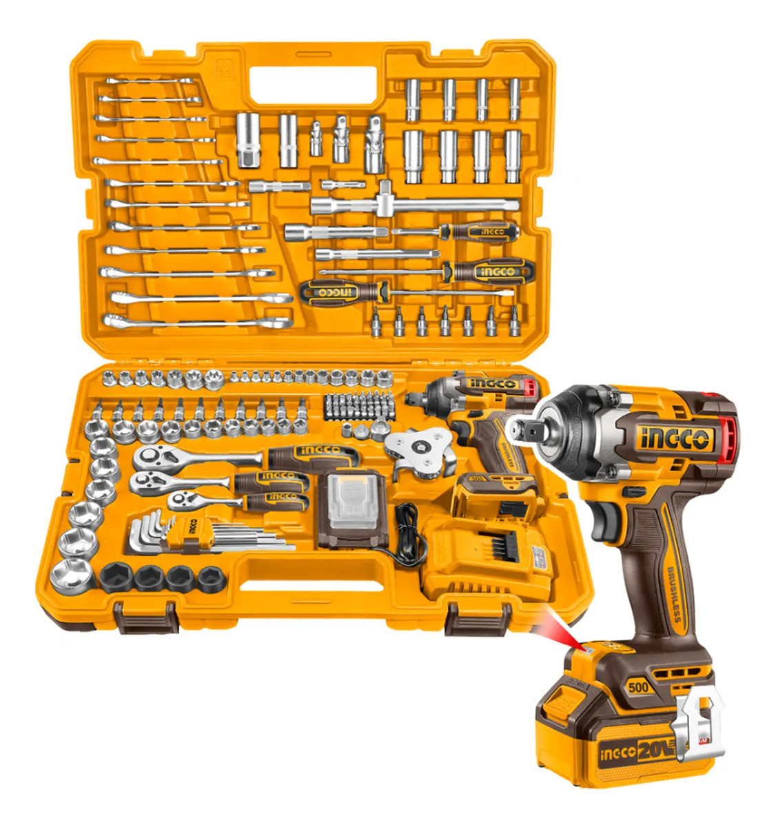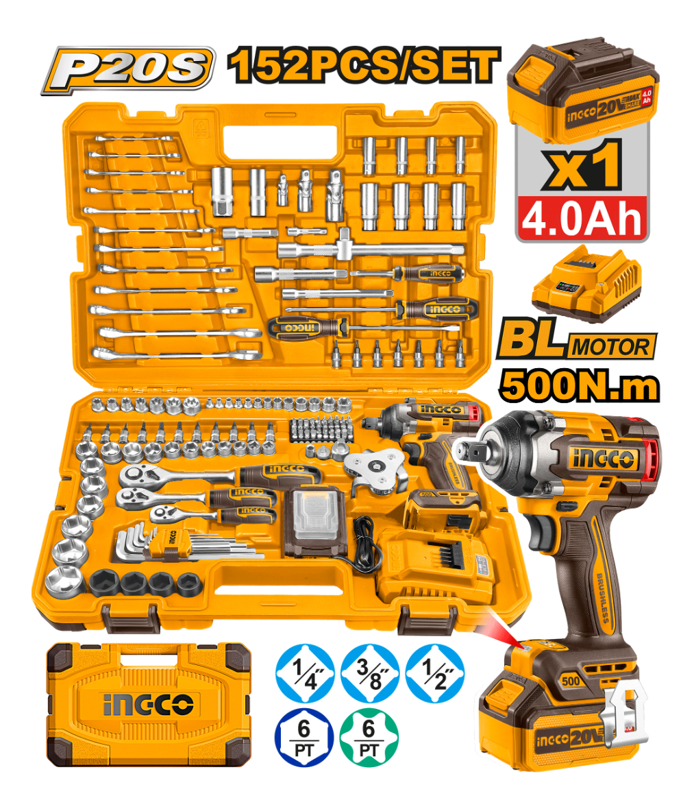 SET 152 HERRAMIENTAS INGCO COMBINADAS CON LLAVE DE IMPACTO P20S 500NM + BATERIA EN VALIJA HKTHP31521