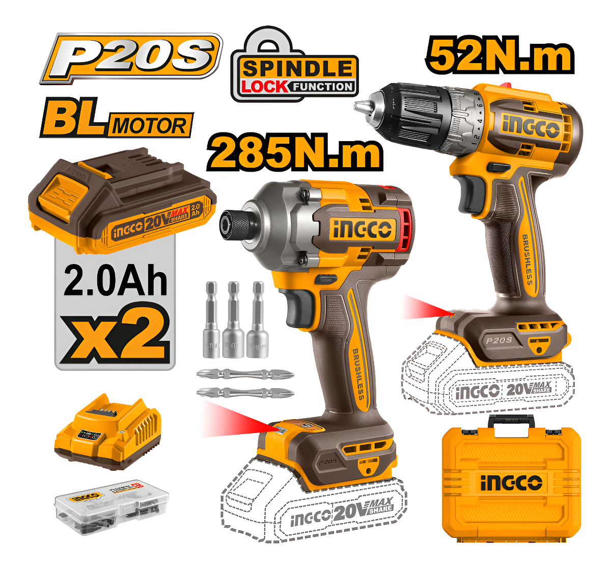 SET ATORNILLADOR DE IMPACTO 20V 285NM + ATORNILLADOR 20V 52NM C 2 BAT CARGADOR + VALIJA INGCO P20S