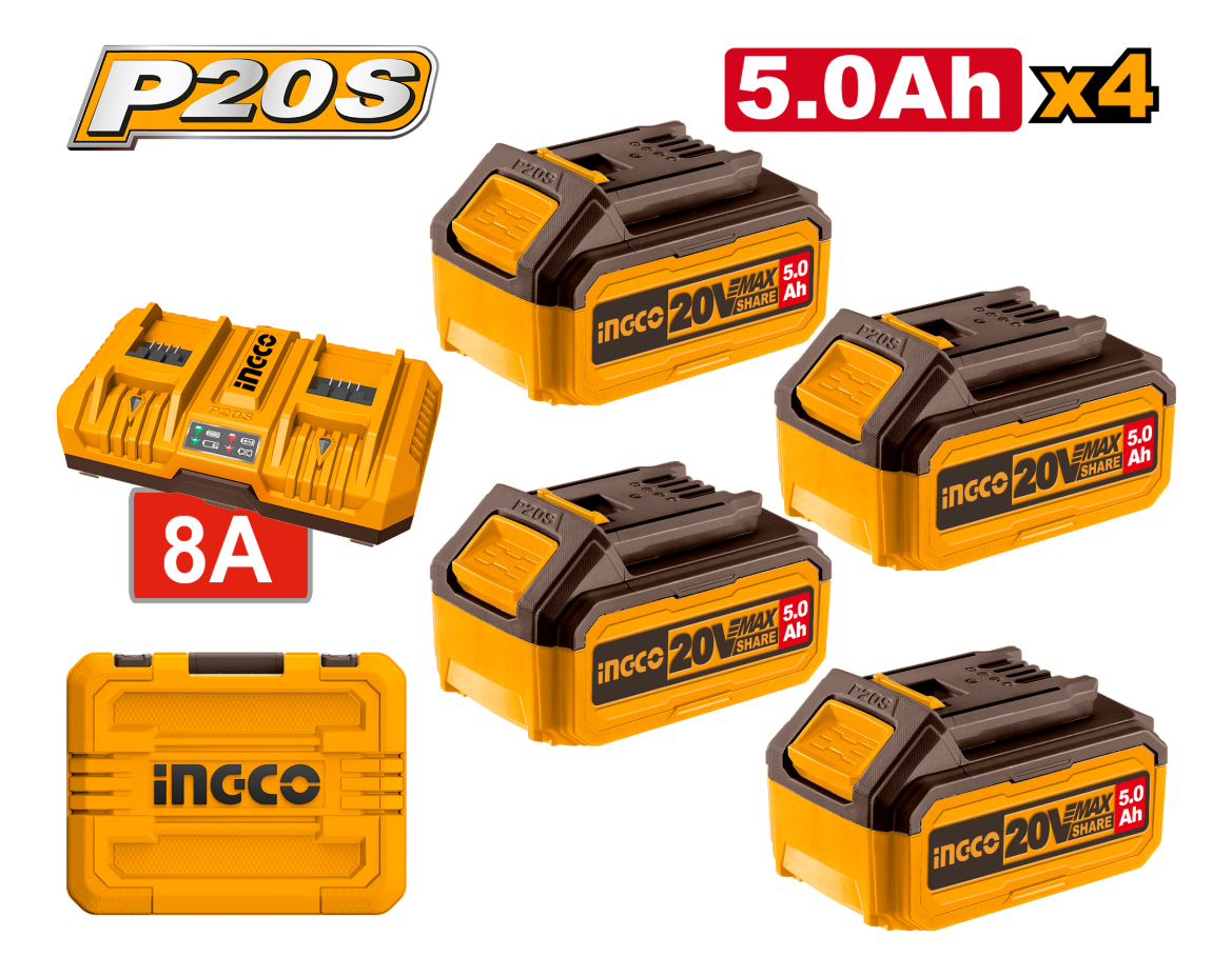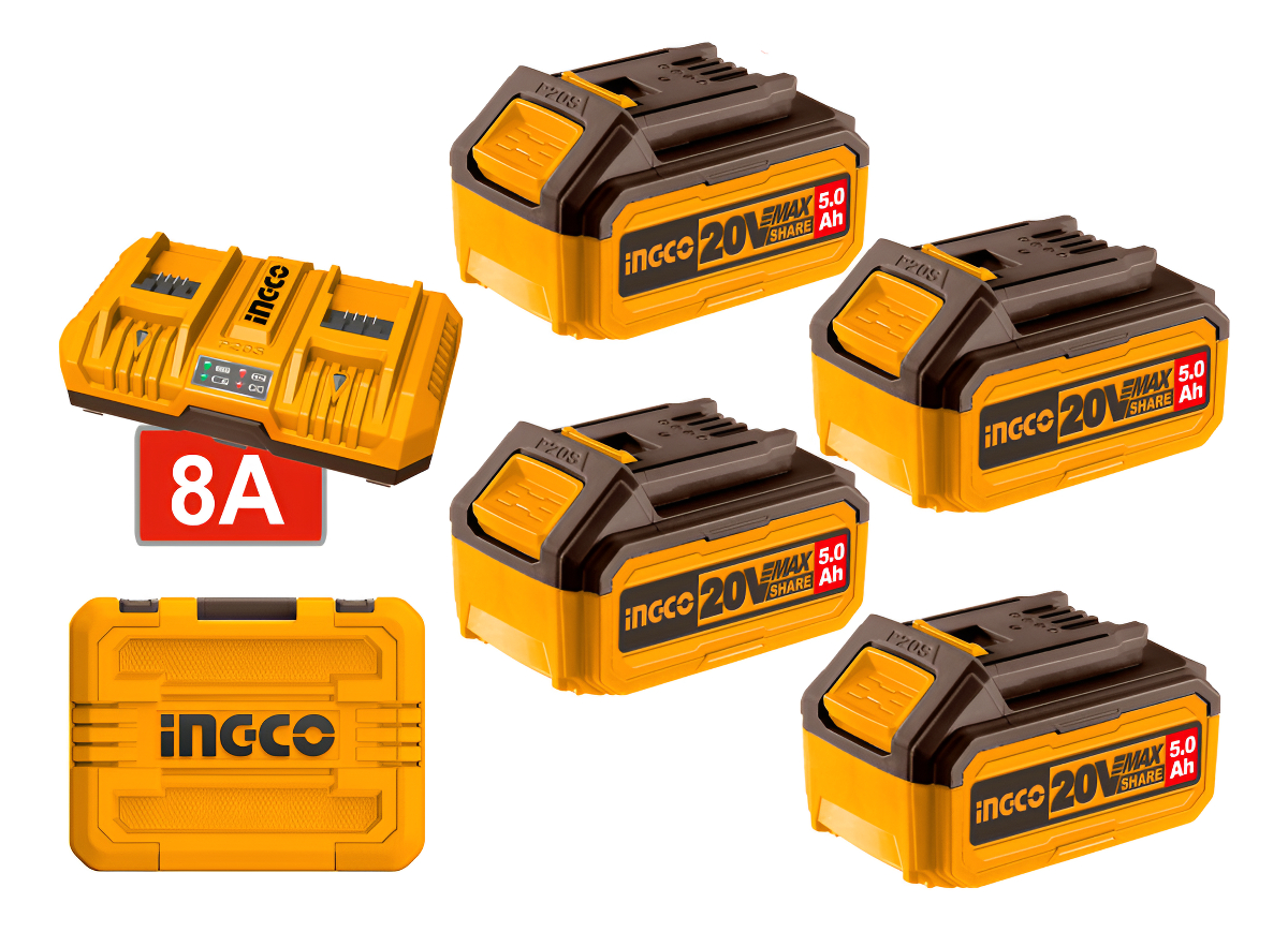 SET X 4 BATERIAS 5AH 20V + CARGADOR DOBLE 8A + VALIJA INGCO