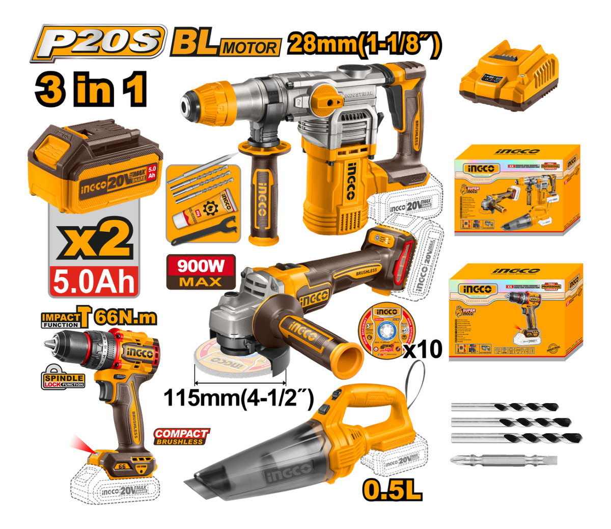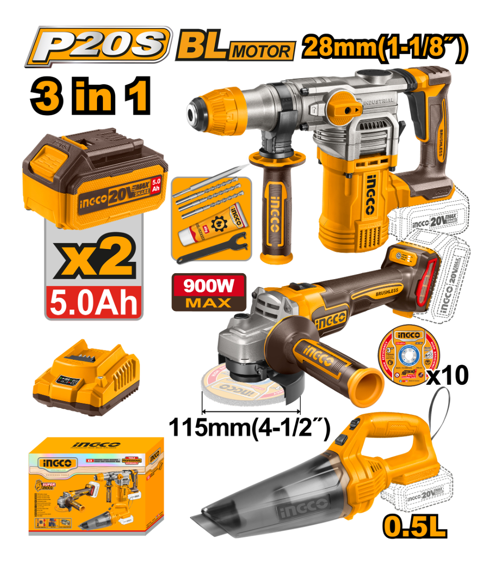 KIT COMBO A BATERIA P20S 20V C/ROTOMARTILLO + AMOLADORA + ASPIRADORA C/ 2 BATERIAS, CARGADOR Y ACCESORIOS