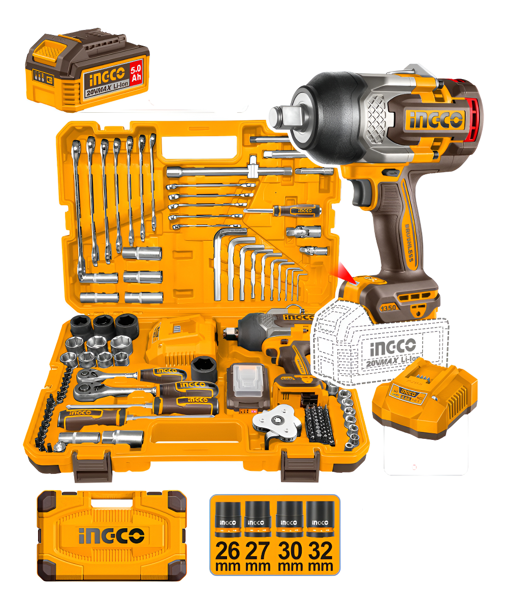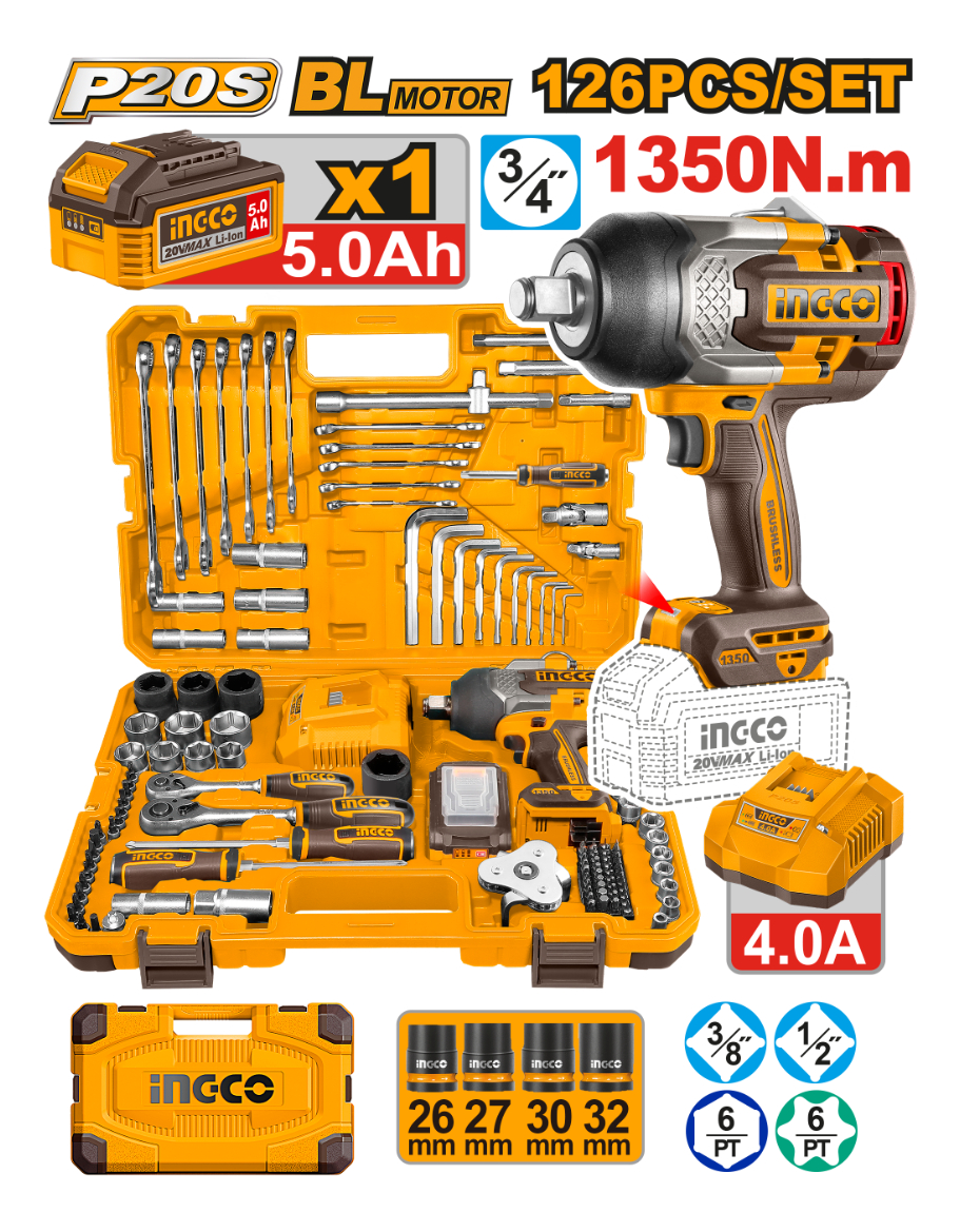 SET LLAVE DE IMPACTO 3/4” 1350NM 20V C/BATERIA 5.0AH + CARGADOR + 126 ACCESORIOS EN VALIJA INGCO HKTHP31261