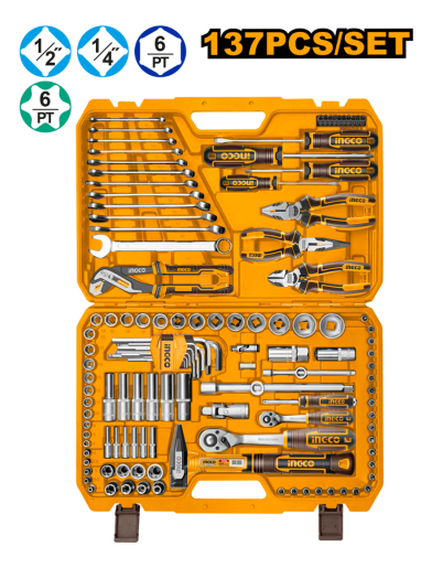 SET X137 PCS JUEGO HERRAMIENTAS COMBINADO C/LLAVES, DADOS, MARTILLO, DESTORN., LLAVES, PUNTAS Y ACCESORIOS + VALIJA INGCO HKTHP21371