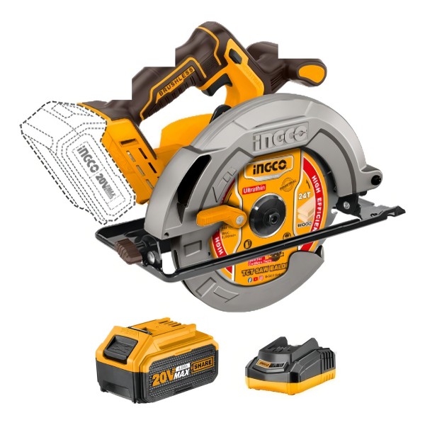 Sierra circular inalámbrica 20v de 7 1/4 » de calidad industrial Ingco BRUSHLESS (sin escobillas) con batería de 4.0 ah y cargador incluidos.
