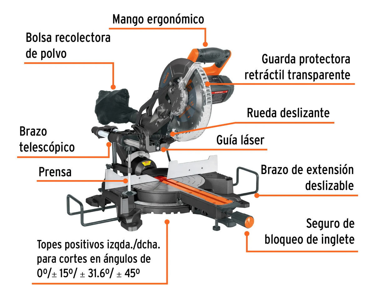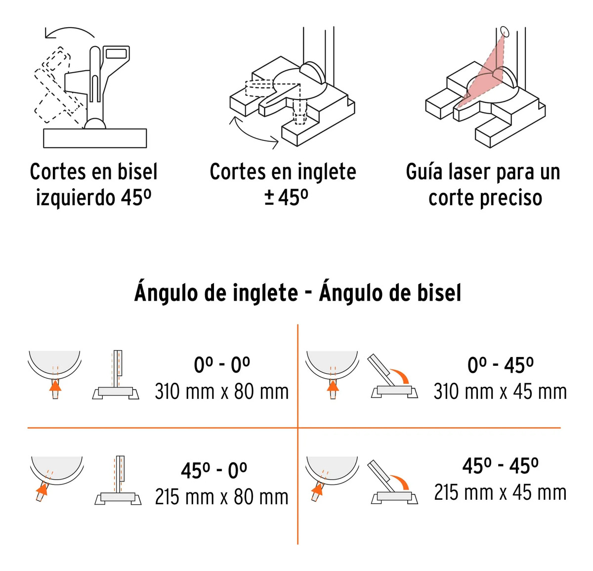 • Cortes en bisel hasta 45° (izquierdo)