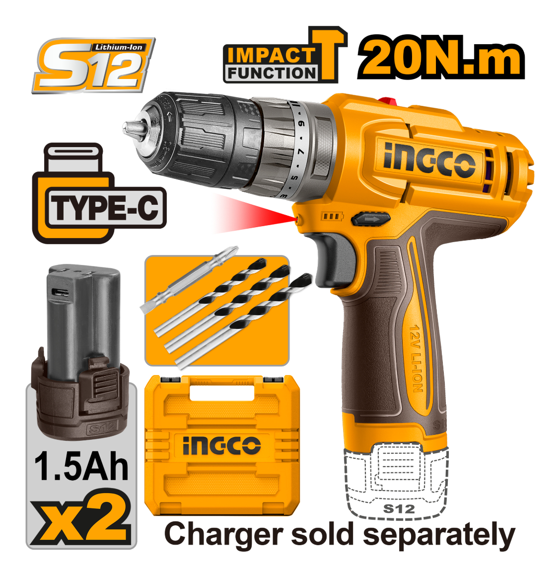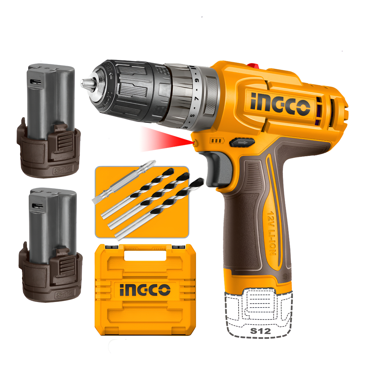 TALADRO ATORN. C/ PERCUTOR A BATERIA 12V 20NM C/ 2 BAT 1.5AH + MECHAS + VALIJA S/CARGADOR INGCO CIDLI122064