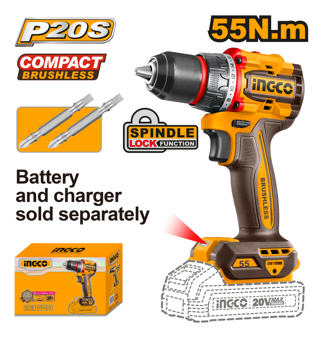 TALADRO ATORNILLADOR A BATERÍA 20V P20S BRUSHLESS 55NM + 2 PUNTAS S/BAT, S/CARG