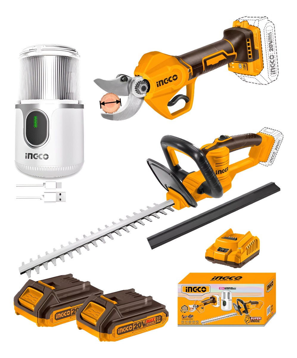 COMBO DE TIJERA DE PODA A BATERIA 20-30MM 20V P20S BRUSHLESS + CORTACERCO A BATERIA 20V P20S + MOLINILLO DE CAFÉ EN CAJA C/2 BAT